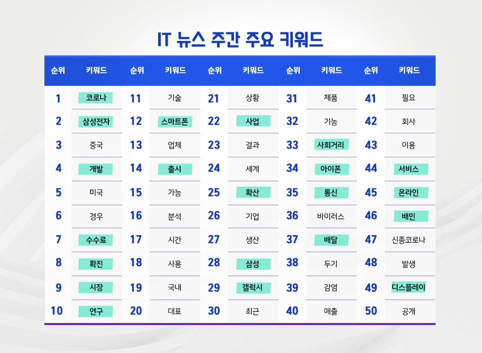 지난달 31일부터 이달 6일까지 지난 주 IT/과학 분야의 주요 키워드는 여전히 코로나19와 연관된 주제가 가장 많았다. 코로나19라는 감염증의 이름이 가장 빈번하게 등장했고, 세계적 기업인 삼성전자 소식이 뒤를 이었다. 다만, 이번에는 엄중하고 중대한 시국에 '배달(37위)'과 '배민(46위)'이라는 연관 키워드가 사회적 논란의 중심에 서면서 크게 주목을 받았다.