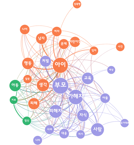 의미네트워크를 살펴보더라도 가해자의 부모에 대해서 문제를 제기하고, 나아가 처벌을 요구하는 방향으로까지 이어지고 있음을 알 수 있다. 댓글을 살펴보면, 가해자가 아직 미취학 아동이기 때문에 그런 일탈행위가 부모의 영향을 받은 것이라는 내용들이 매우 빈번하게 나타난다.