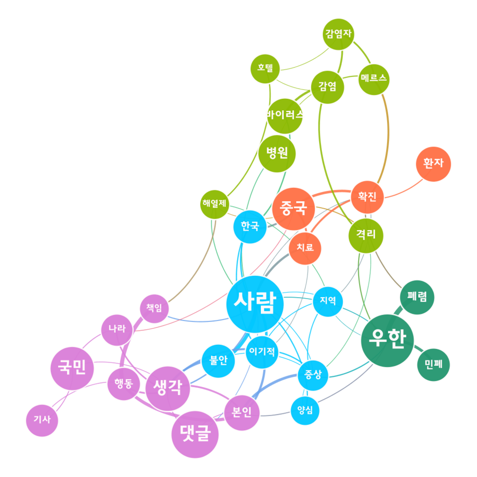 이는 의미 네트워크 분석에서 더욱 구체적으로 드러나는데, 가장 핵심은 우한 폐렴을 핑계거리로 대지 말라는 것이었다. 이러한 맥락은 경제 정책 전반에 대한 비판으로 이어지는데, 댓글을 통해 신종 코로나바이러스와 관련 없는 소득주도 성장에 대한 비판이 나타났다. 또한 다른 바이러스 관련 댓글과 마찬가지로 중국인의 입국을 금지하라는 요구도 비중 있게 나타났다.