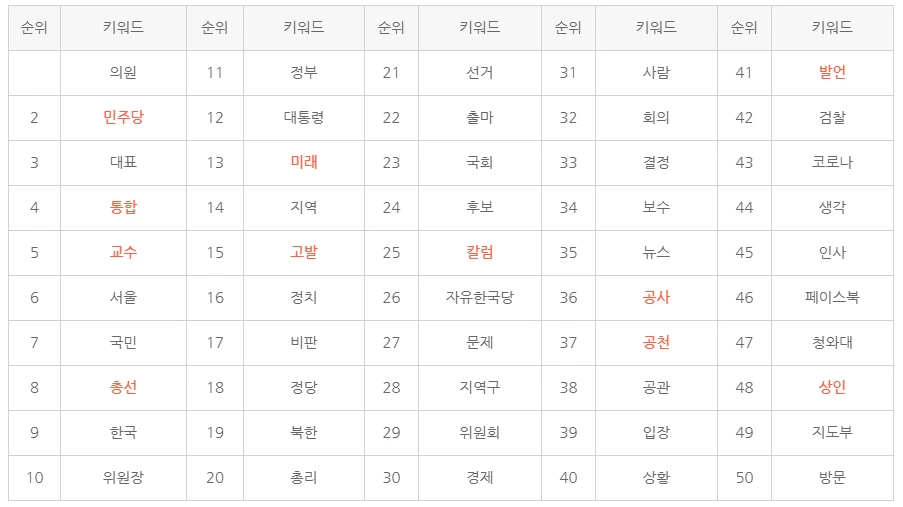 아무래도 총선 기간이다 보니, 전현직 국회 ‘의원’과 관련된 어휘가 많았다. 또한 총선을 준비하는 정계개편과 관련된 어휘들이 많이 나타났다. 이 밖에도 ‘공천’과 같은 어휘도 비중 있게 등장해 본격적인 총선 정국 개시를 알리고 있다.