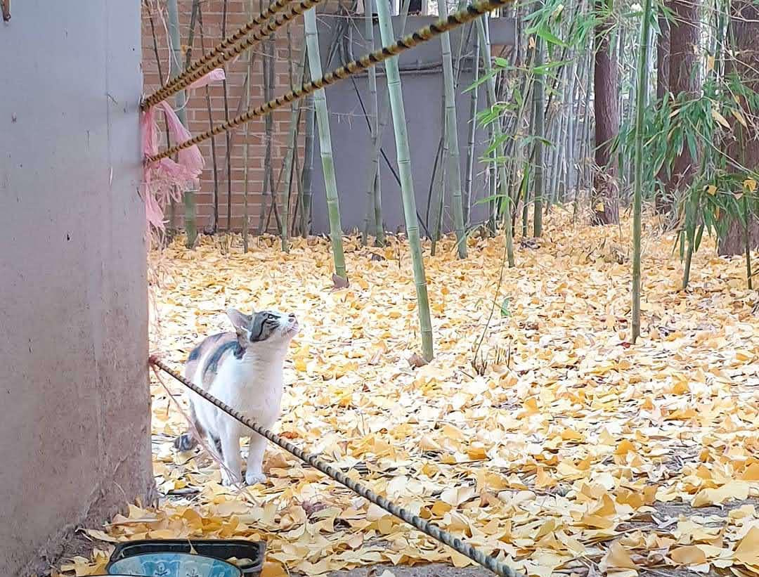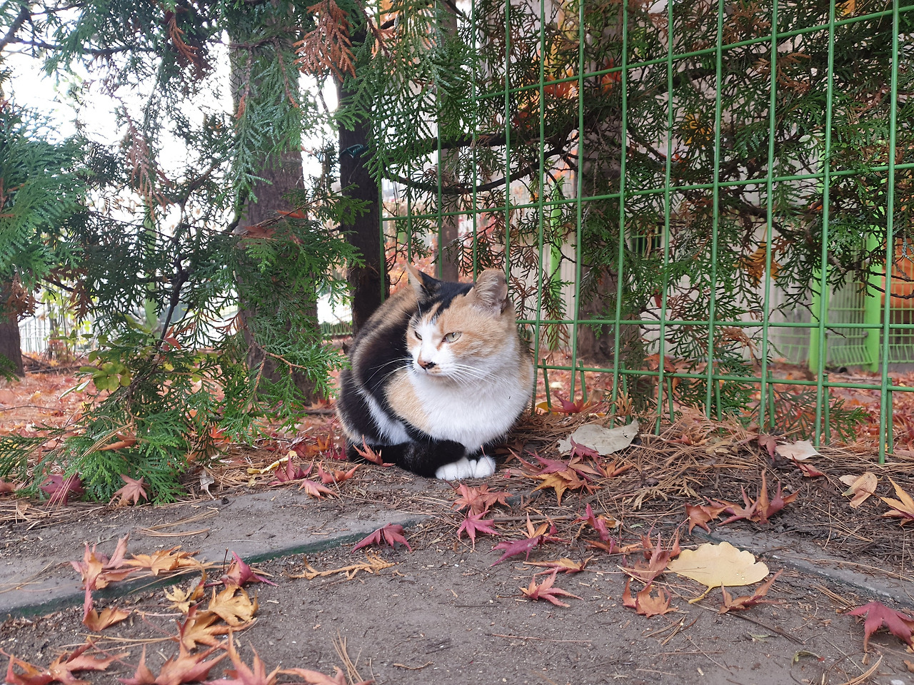 낙엽 밟으며 캣맘을 기다리는 아이들