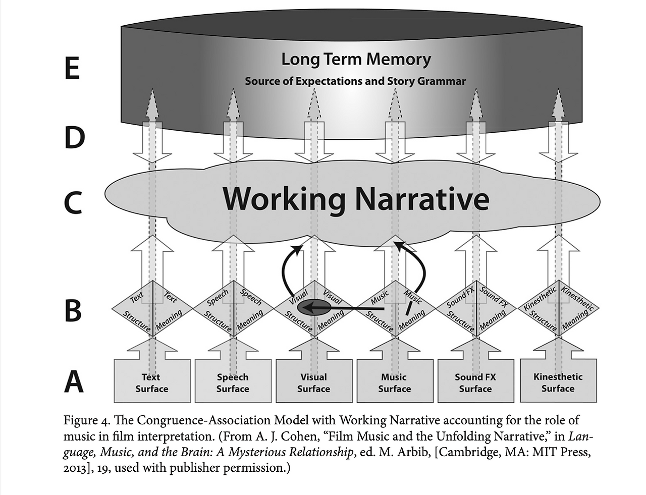 캐나다의 Annabel J. Cohen 교수는 우리가 영화나 게임 같은 미디어를 경험할 때 뇌에서 일어나는 복잡한 과정을 연구했습니다. 2006년 "The Role of Music, Sound Effects & Speech on Absorption in a Film"에서 처음 제시하고, 2013년 MIT Press 『Language, Music and the Brain』에서 더욱 발전시킨 'Congruence-Associationist Model'은 우리 뇌를 하나의 거대한 정보 처리 회사로 비유합니다.