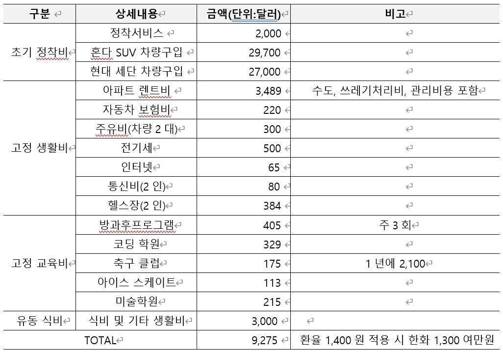그러나 시간이 지날수록 마음이 흔들리기 시작했다. 한국에서 떠나올 때 우리가 예상했던 것보다 생활을 위한 고정 지출비가 컸던 이유였다. 명품백이나, 고급차는 없어도 경험하는 것에는 돈을 아끼지 말자고 생각해온 우리였기에 미국행을 선택할 수 있었고, 벌이 없이 지출만 하는 상태에서도 여행, 축구, 코딩, 수영, 스케이트 등 경험과 배움을 위한 것에는 돈을 아끼지 않은 우리였는데 그렇다 보니 꼭 필요한 것에만 지출을 하는 나름대로 알뜰한 생활 방식을 유지하는 상태에서도 월1,000만원이 넘는 금액이 평균 생활비로 지출되고 있었다. 남편의 석사과정 학비나 현지에서 등록한 나의 요가 지도자 과정 등의 규모가 큰 비용을 제외하고도 월평균 생활비가 한화로 1,000만원이 넘는 실정에 마음이 무거웠다.