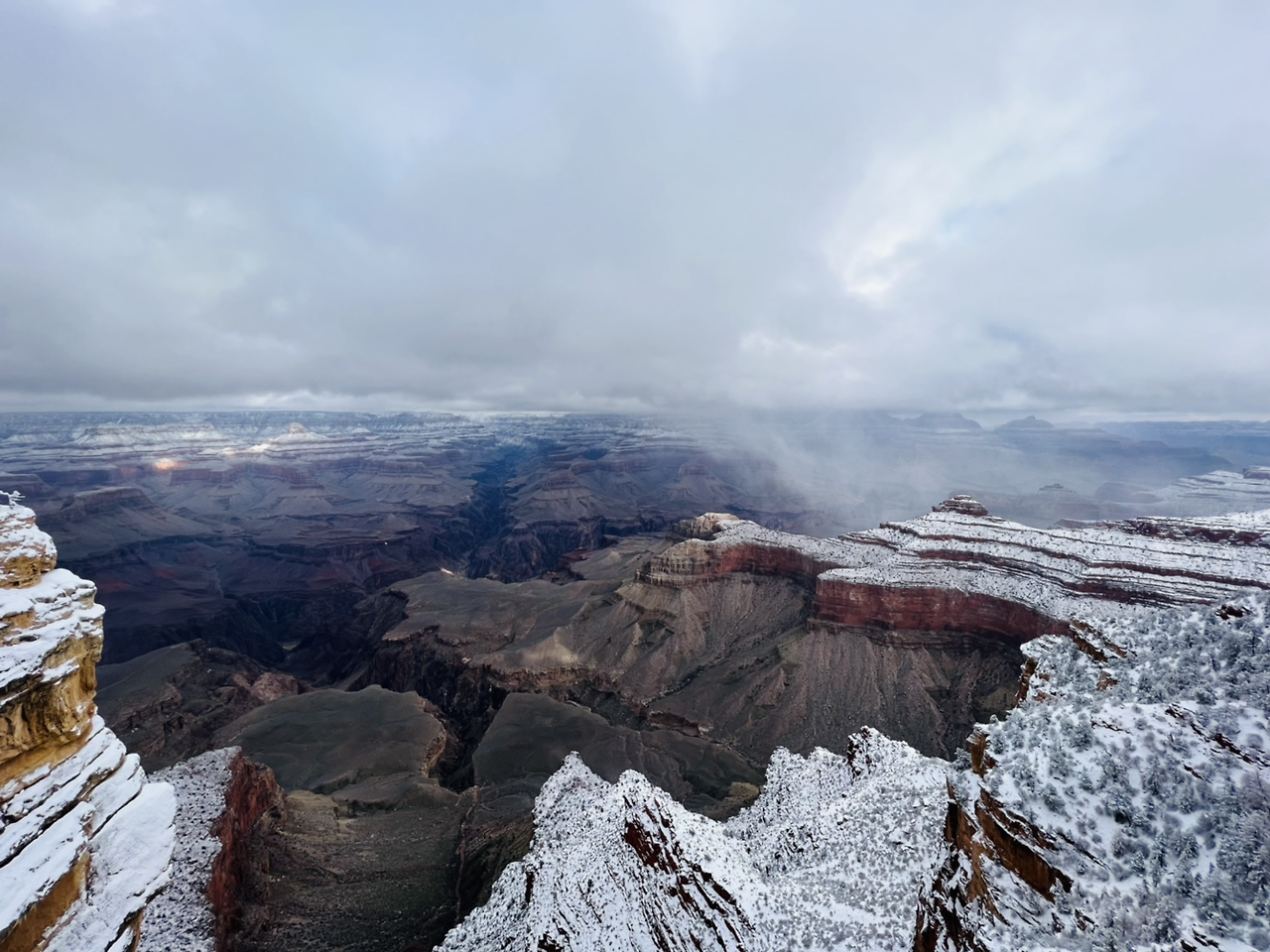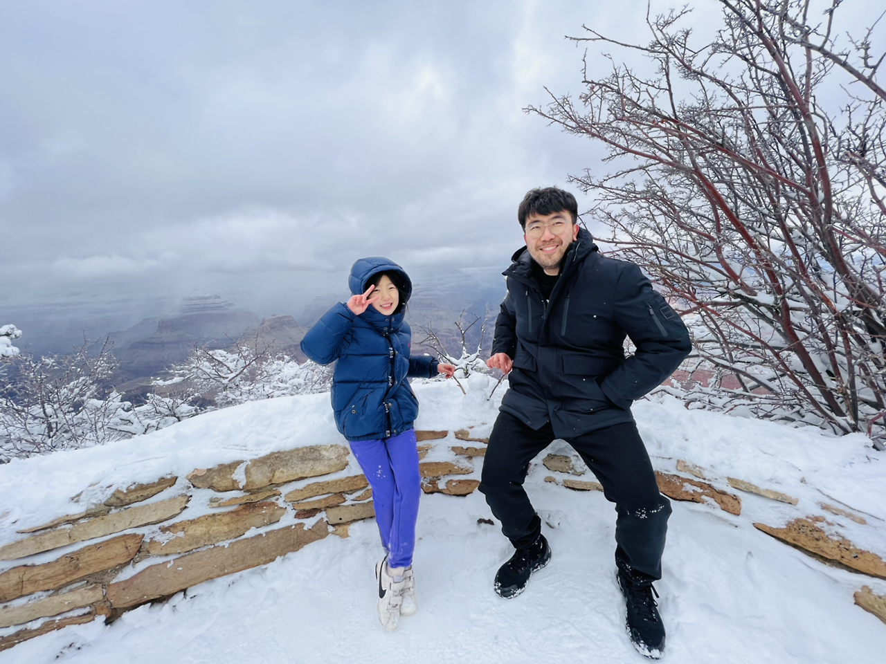 가족 모두 피곤했는지 오전 11시가 넘어서야 겨우 눈을 떴다. 얄궂게도 새벽까지 쏟아질 듯 내리던 폭설은 거짓말처럼 그쳐 있었다. 정강이까지 쌓여있던 눈도 제설차의 빠른 작업으로 깨끗이 정돈되어 있었다. 그러나 지난밤을 떠올리며 언제 또 폭설이 시작될지 모른다는 불안감에 서둘러 짐을 챙겨 나왔다. 오늘은 대망의 그랜드 캐년으로 가는 날, 미국의 국립공원 중 가장 인기 있는 국립공원이니만큼 큰 기대감을 안고 방문한 그랜드캐년에는 지난밤의 폭설에도 불구하고 많은 사람들로 인산인해를 이루고 있었다.
