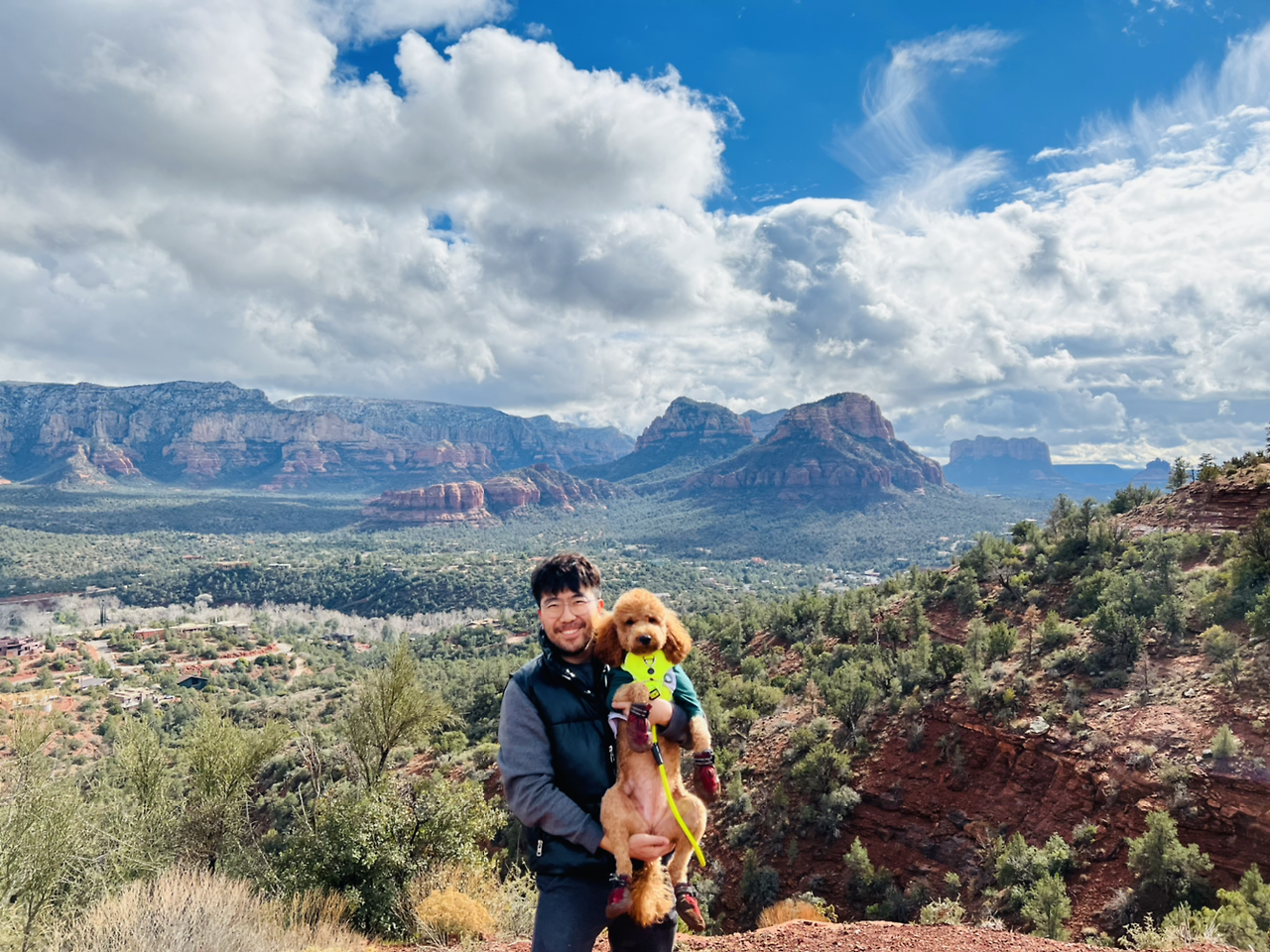 13살인 초코는 길이 험난해 가고 싶지 않았던지 걸음을 떼지 않고 자꾸만 몸에 힘을 주어 버티며 거부 의사를 비추기에 다시 차에 데려다 놓고 마음이만 동행해 트레킹 코스로 들어섰다. 진흙투성이 길이 너무 힘들어 돌아가고 싶은 마음이 굴뚝같았지만 언제 또 이곳을 올 수 있을까 하는 마음에 꾹 참고 계속해서 걸음을 옮겼다. 마침내 정상에 도착했을 때 도시가 한눈에 내려다 보이는 장관이 우릴 기다리고 있었다. 세도나의 전경을 내려다보며 앞으로 미국에서 보낼 여정이 우리 가족 모두에게 의미 있는 시간이 되기를 바라는 마음으로 벨락의 에너지를 품고 다시 온 길을 되돌아왔다.