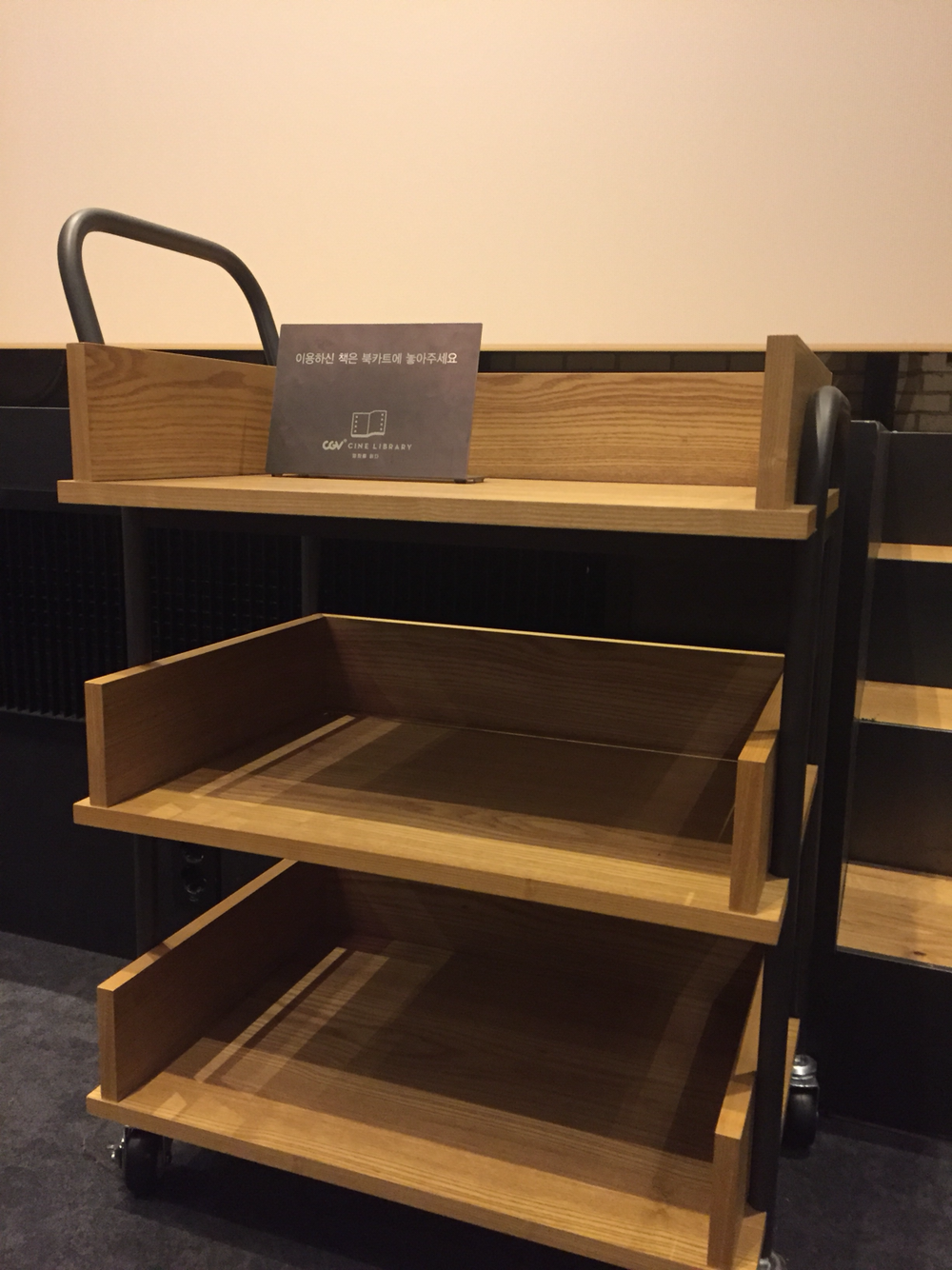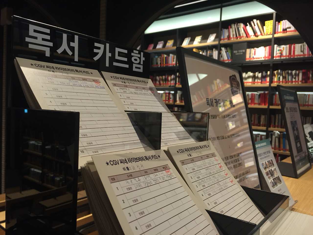 씨네라이브러리에는 독서카드가 있어 본 책에 대해 아날로그로 기록을 남길 수 있어요. 자주 방문하시는 분들에게는 좋은 독서습관과 기록의 의미까지 더할 수 있을 것 같아요. 다 본 책은 곳곳에 있는 트레이에 올려두면 사서분께서 정리를 해주신다고 해요. 북카터마져 너무 예뻐서 사진을 찍었답니다. 일정이 있어서 일찍 나와야 했지만 영화와 책을 사랑하는 사람으로서 이런 공간은 점점 더 많아져야 한다고 생각해요.