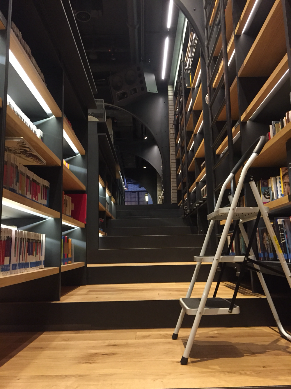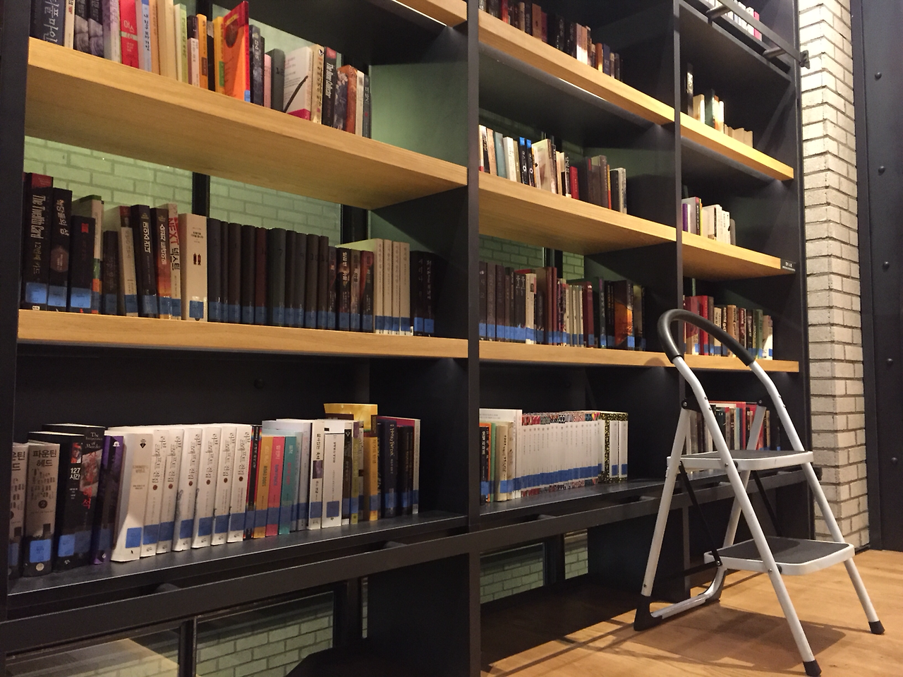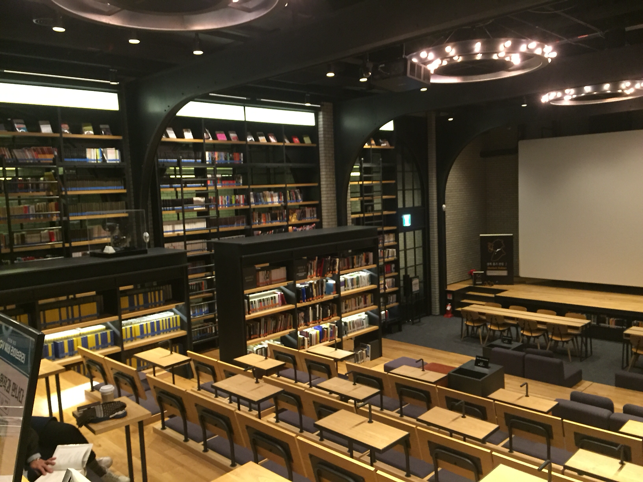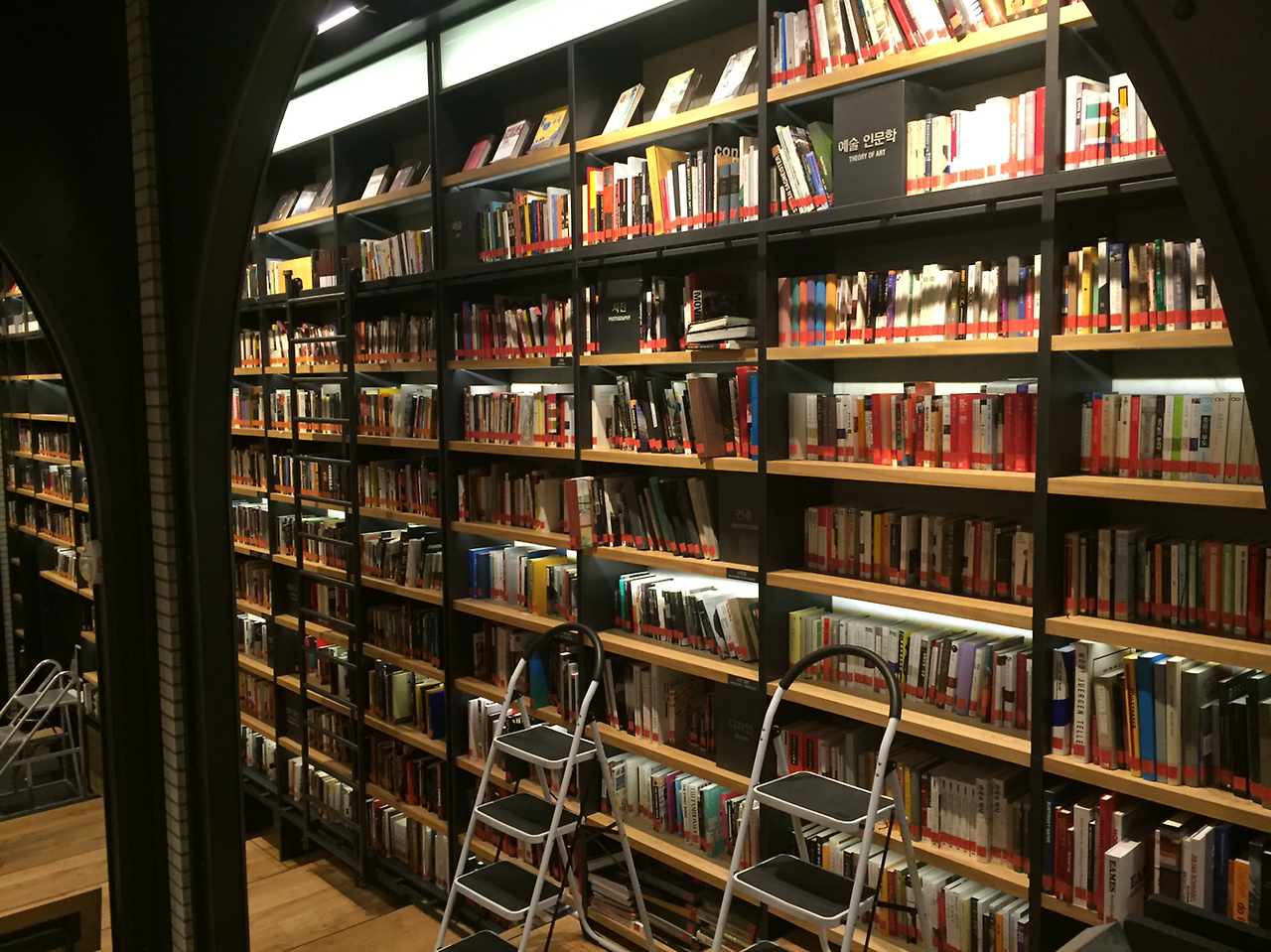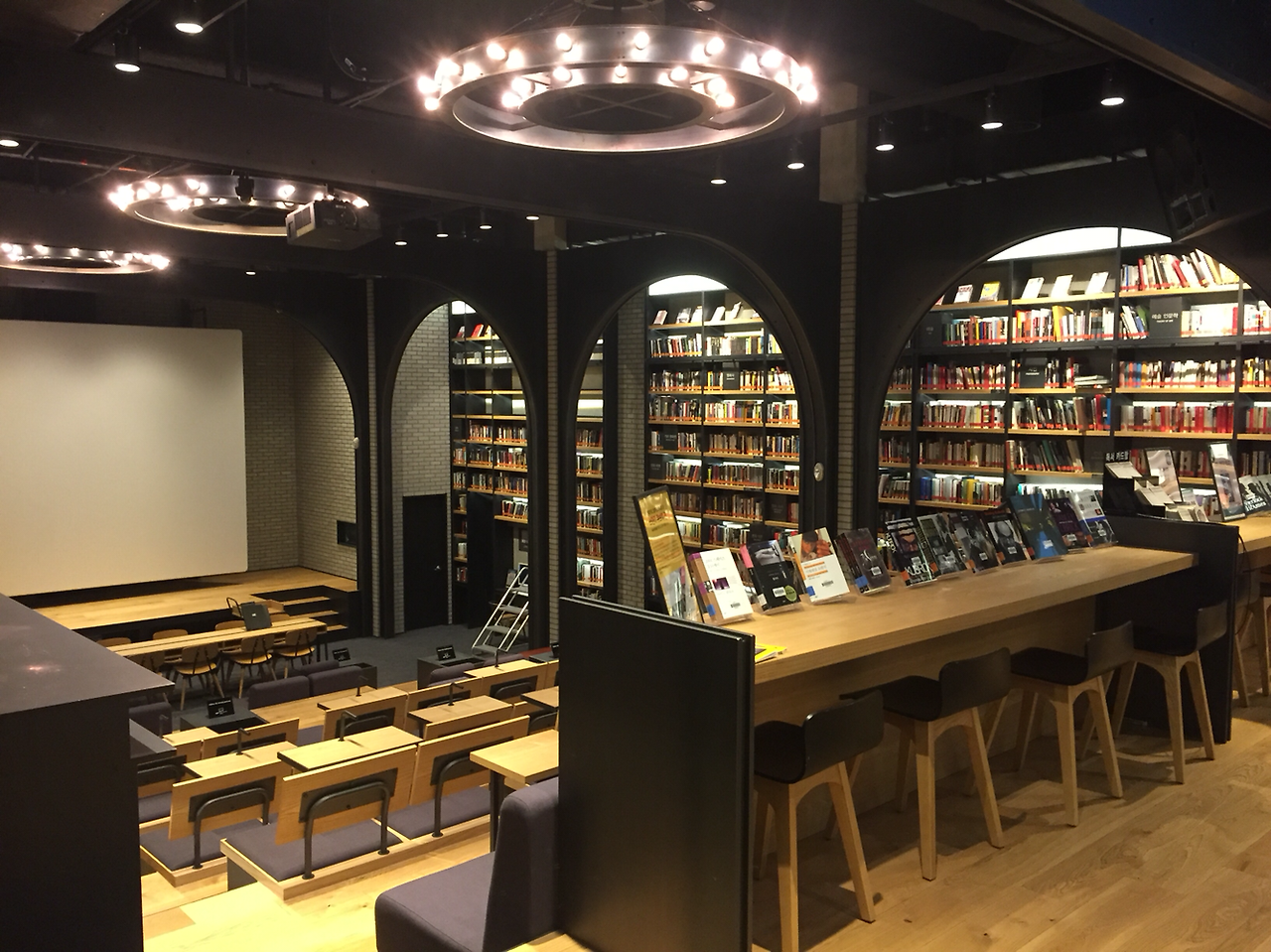 입장권을 제시하고 들어선 순간 보이는 라이브러리의 모습은 너무도 예뻤습니다. 씨네 라이브러리 답게 무대와 함께 책을 읽는 공간을 중심으로 3면에 책들이 책장 가득 전시되어 있었거든요. 높은 곳에 있는 책은 사다리를 끌고가서 꺼낼 수 있는데 마치 영화 속 장면같이 느껴졌던 건 씨네러리브러리만의 분위기 때문일테죠.