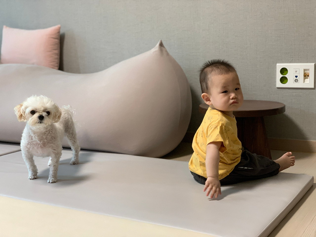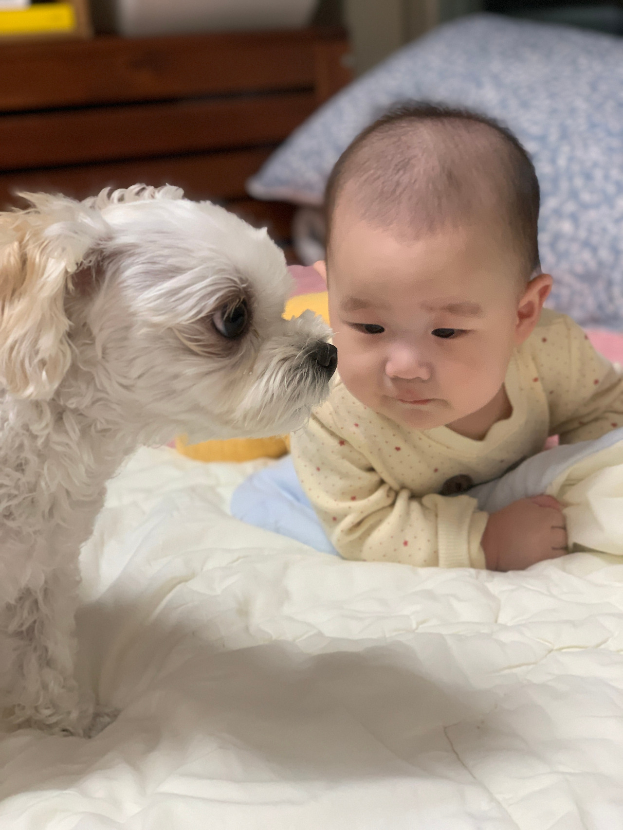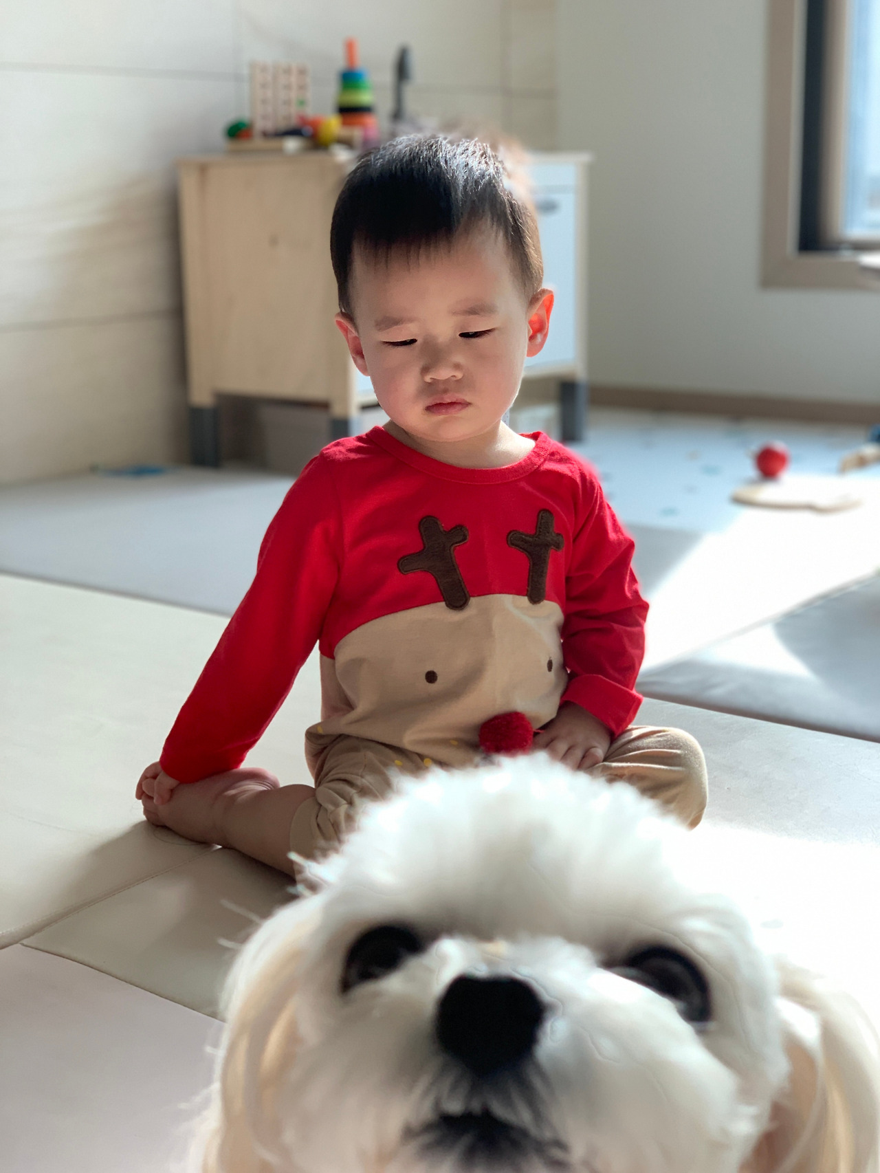 우리 가족은 저와 남편, 15년생 말티푸 바닐라, 그리고 18년생 남자아이 윤우가 함께 살고 있습니다. 2018년 6월 우리 집 막내아들 윤우가 태어나면서 저의 '애개육아'가 시작되었답니다. 많은 분들이 아이와 반려동물을 함께 키우고 싶은 로망이 있듯 사랑스러운 두 존재는 제게 일상의 기쁨이 무엇인지 알게 해 준답니다. 물론 행복을 주는 만큼 쉽지 않은 애개육아는 보호자의 역할이 너무 중요하답니다. 오늘은 아이와 반려동물과 함께 살아서 좋은 다섯 가지 이유를 소개드리려고 합니다.