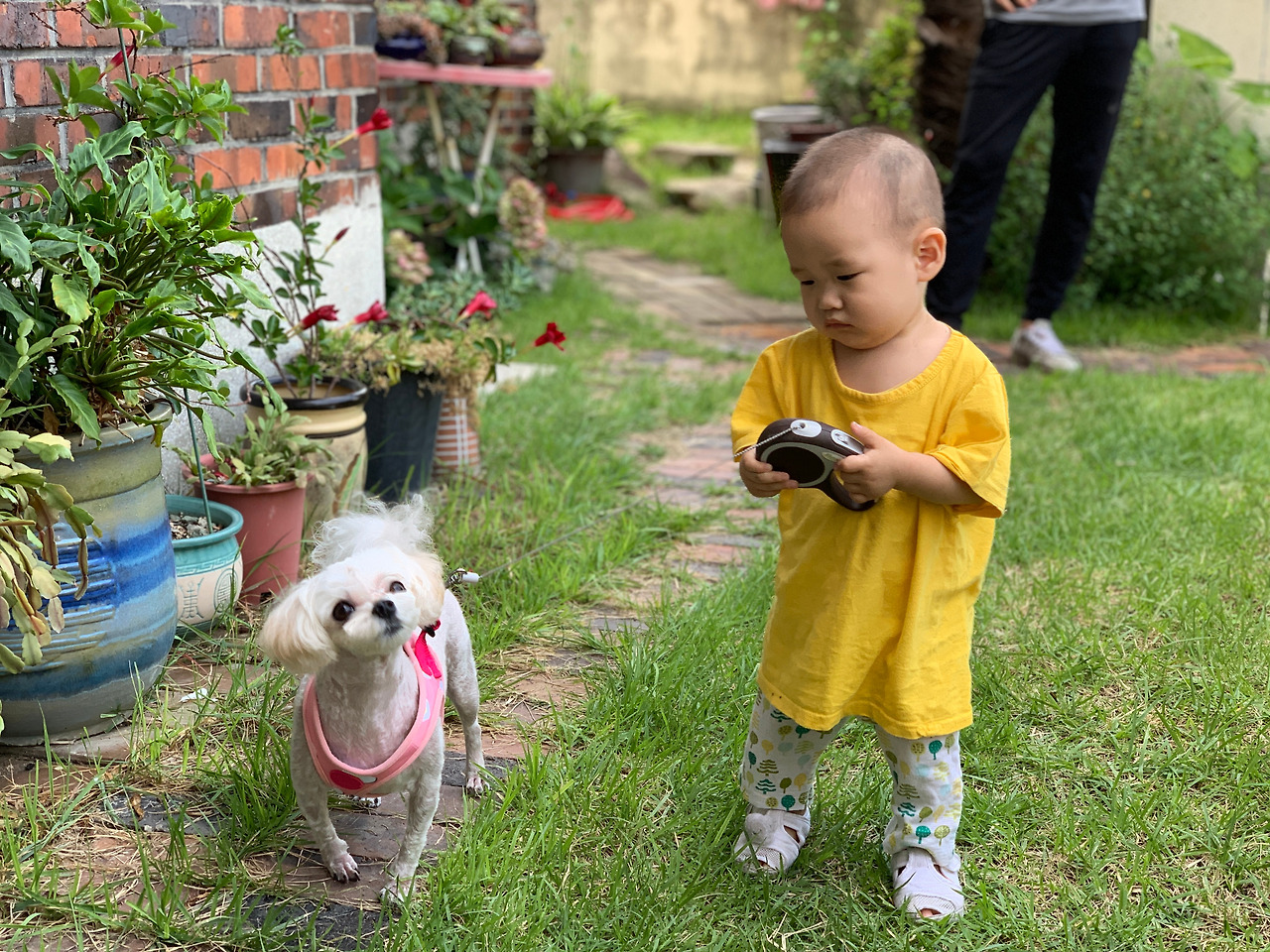 반려견과 함께 산다면 하루에 한 번은 산책을 하게 됩니다. 아이가 태어나기 전부터 해왔던 것이지만 윤우가 외출이 가능해진 시기부터는 가족 모두가 함께 산책을 하는 시간이 참 좋습니다. 윤우를 유모차에 태우고 바닐라에겐 하네스와 목줄을 채웁니다. 주로 아파트 단지 내를 산책하지만, 가끔은 한강공원을 다니기도 합니다. 윤우가 걷기 시작한 후부터는 함께 걸으며 산책합니다. 요즘은 스스로 반려견 목줄을 잡겠다고 고집을 부릴 때가 많은데요. 그럴 땐 산책보다는 제자리에 서서 노즈 워크*를 하곤 합니다. 반려견이 용변을 보면 제가 수습을 하는 모습도 보더니 이젠 스스로 배변 봉투를 들고 다니더라고요. 언젠가 혼자 힘으로도 반려견 케어가 가능할 때까진 함께 손 잡고 산책할 거랍니다.