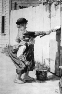 톰은 고아다. 폴리 이모가 대신 톰을 맡아 키운다. 조카인 톰의 말썽으로 폴리 이모는 머리가 지끈거린다. 또 말썽을 부자 이모는 톰에게 벽에 페인트칠하는 벌을 준다. 톰은 놀지도 못하고 페인트칠을 하려니 한숨만 나온다. 골똘히 생각하다 꾀를 내는 톰. 이때 친구 벤 로저스가 지나가자 “있지, 짐도 칠하고 싶어 했는데 이모가 안 된다고 했거든, 시드도 하고 싶어 했지만 이모가 허락하지 않았어.”(p.31)라며 자기만 칠을 할 수 있다고 우쭐거린다. 칠을 하고 싶은 친구들은 소중한 물건들을 톰에게 주며 한 번만 칠하게 해달라고 조른다. 톰은 사람의 심리를 이용할 줄 안다. 갖지 못할 때 인간은 더 갖고 싶은 심리가 있다.