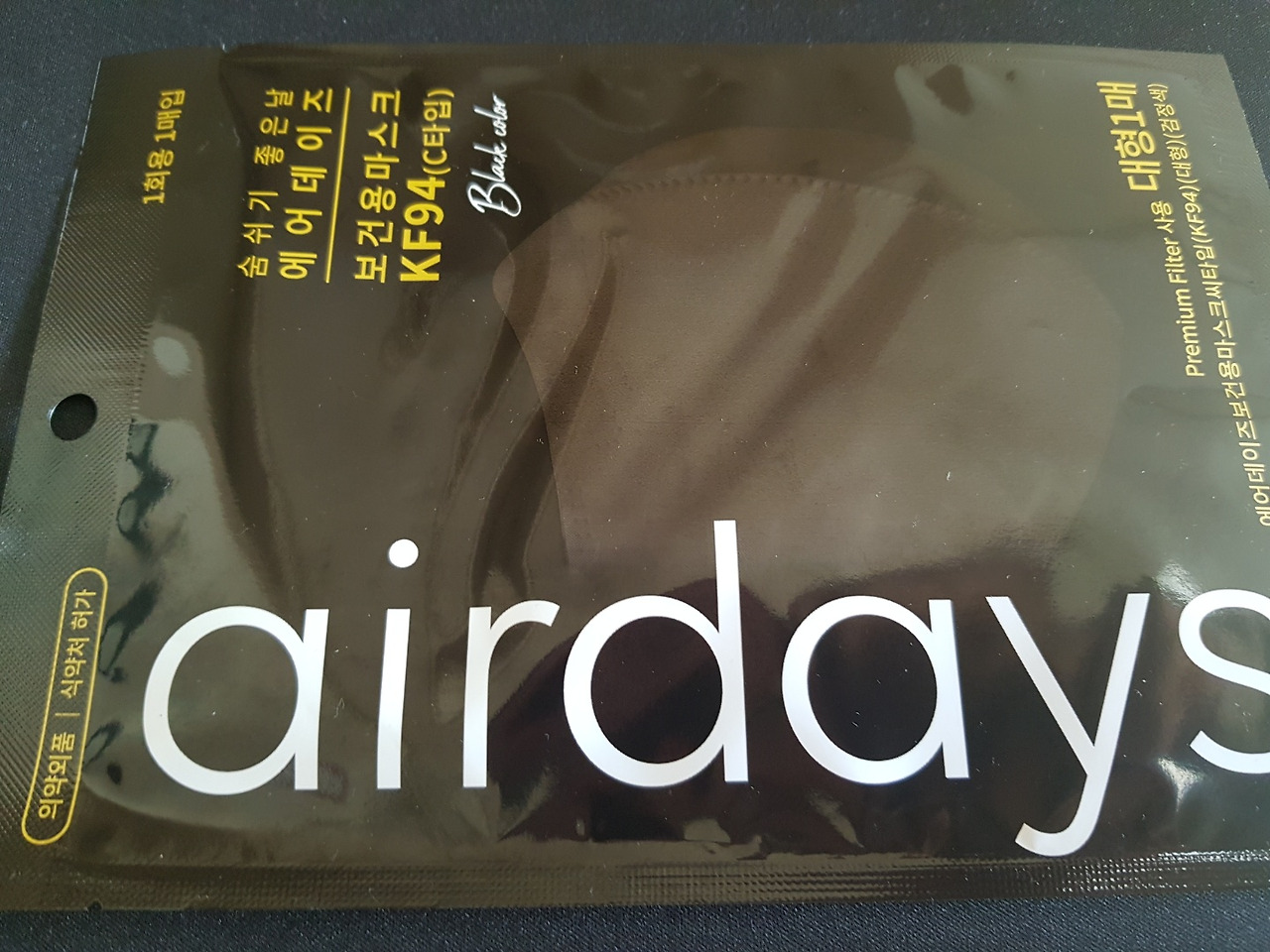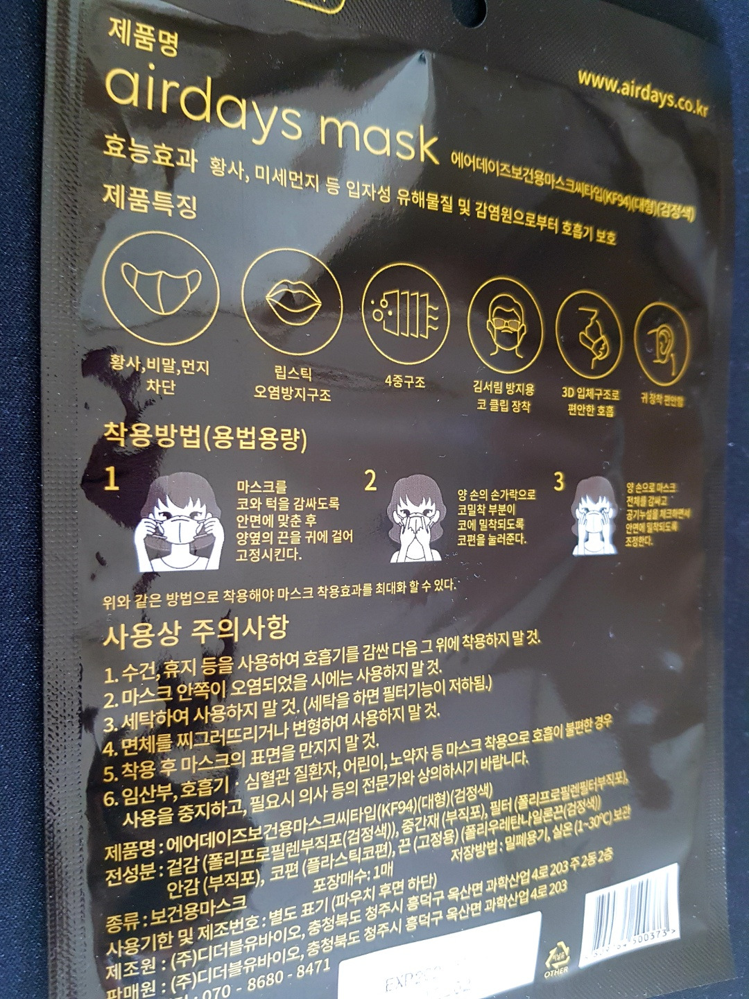 어쩌다 마스크를 쓰는 시대가 됐다. 요즘은 에어데이지 마스크를 애용한다. 편안한 마스크를 찾았다. 귀도 아프지 않고, 숨쉬기가 좋다. 에어데이즈 마스크를 착용하고부터는 쭉 요녀석만 쓴다. 칼라는 역시 블랙. 게다가 Made in Korea이다. 신뢰도가 상승한다. 공장은 충청북도 청주 옥산면에 있다. 제조원, 판매원 모두 (주)디더블유바이오이다.