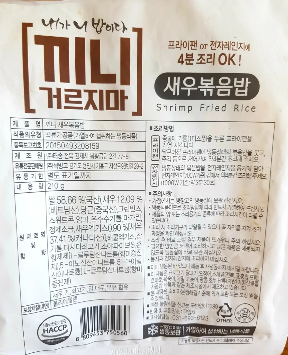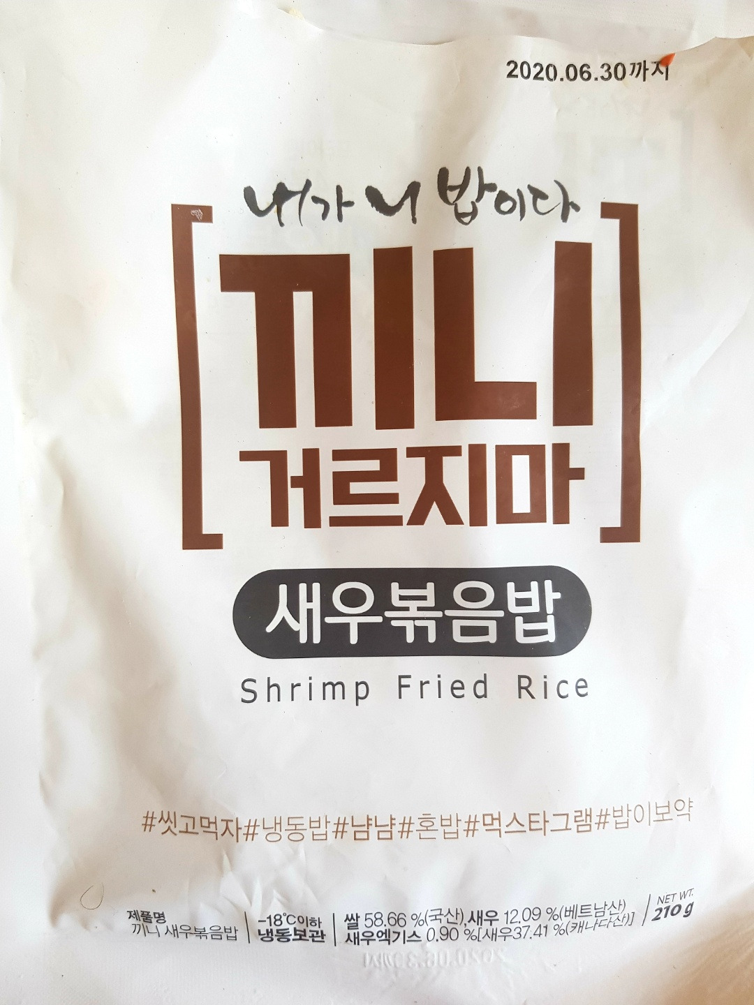 인스타 해시태그처럼 포장지에도 #가 있다. 끼니 새우볶음밥은 (주)태송에서 만든다. 공장은 전북 김제시 봉황 공단에 있다. 새우는 베트남산. 휘리릭 볶아 한 끼 때우기 좋다.