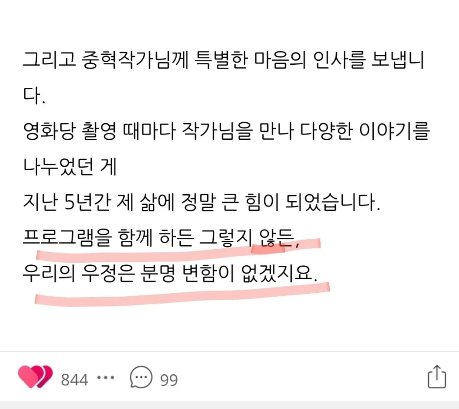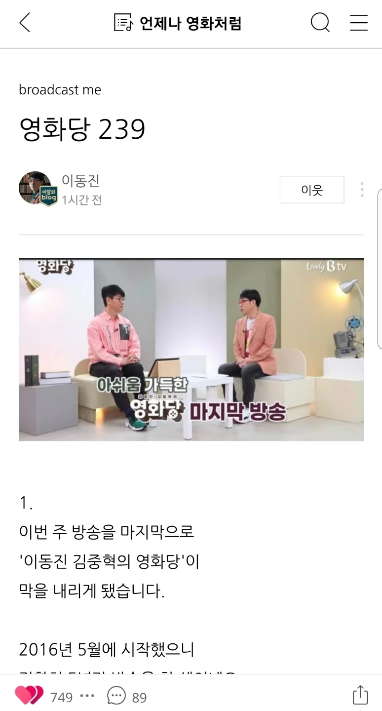 '영화당'은 2016년 5월에 시작해 2021년 5월 30일에 끝났으니 정확히 5년간 방송을 한 셈이다. <영화당>을 아끼는 시청자로 서운함이 물밀듯이 몰려왔다. 이동진 평론가는 블로그에 짧은 인사말을 남겼다. Btv 관계자들에게 감사를 전했고, 시청자와 출연자 및 카메라 뒤에서 수고해 주신 분들께도 인사를 전했다. 특히, 함께 진행한 김중혁 작가에게 마음을 표했다.
