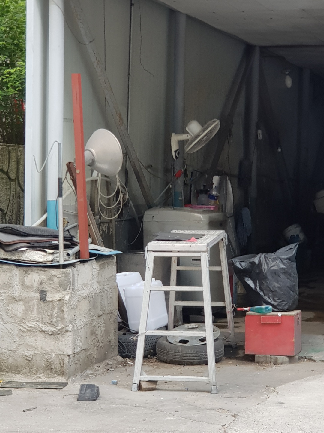 이곳은 카센터. 누군가의 작업실이다. 자동차를 정비하고, 부속품도 교체하고, 차 인테리어를 해주는 곳이다. 여기서 배터리도 갈아주고, 광택도 내주고, 엔진오일도 바꾼다. 나는 운전면허가 없다. 차에 대해 아예 모른다. 당연히 이런 카센터에 올 일도 없다. 그냥 스쳐도 좋았을 작업실을 또ㅡ찍고 말았다. 왜냐고 묻는다면 그건 저기 보이는 세탁기 옆에 붙어 있는 선풍기. 그래. 바로 저 녀석 때문이라고 말해 줄 수 있다. 하얀색 선풍기가 '누군가'를 위해 작업장 벽면에 대롱대롱 매달려 있다. 뜨거운 날 제 몸뚱이를 옆에서 옆으로 회전하며 시원한 바람을 만들겠지.