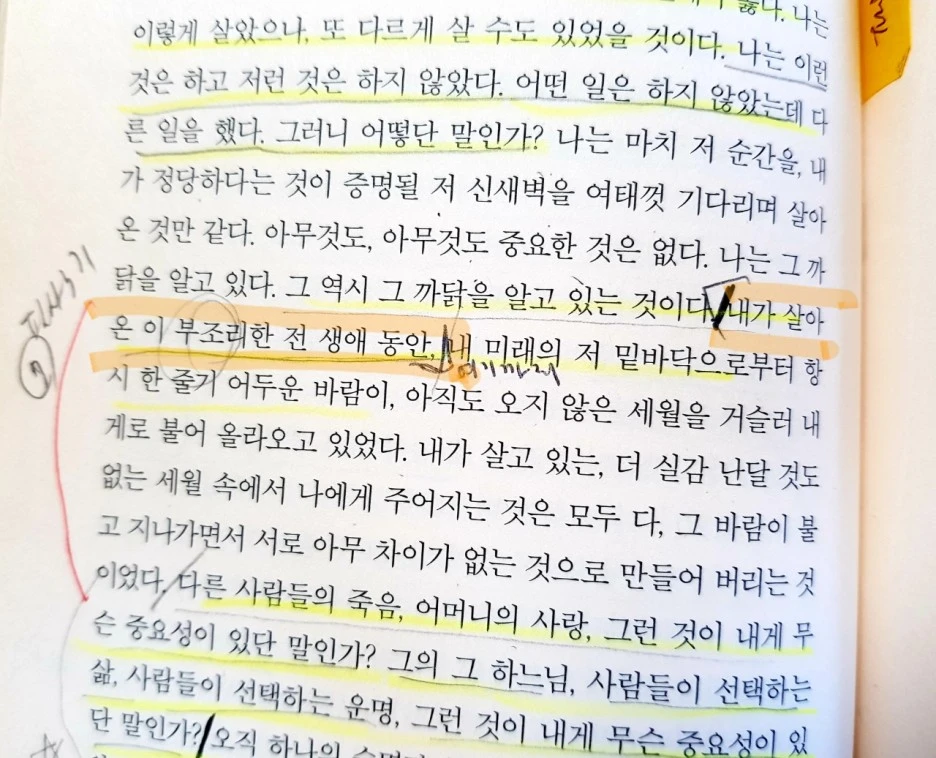 뫼르소가 사형대 앞에서 할 말이다. 죽음은 부조리하고, 서글프지만 이제 곧 휴식에 들어간다. 이 한 세상 이렇게 실존했고 사라질 뿐이다. 이것만은 확실하다. 아무도 엄마의 죽음을 슬퍼할 권리는 없는 것이다. 당신들도 죽을 것이기에. 똑같은 조건인데 누가 누굴 애도한단 말인가. 뫼르소의 마지막 소원은 자신이 단두대 앞에 섰을 때 많은 사람들이 와서 증오의 함성을 질렀으면 하는 바람뿐. 메멘토 모리(Memento mori) 죽음을 직면하라. 죽음의 현장에서 삶을 생각하라.
