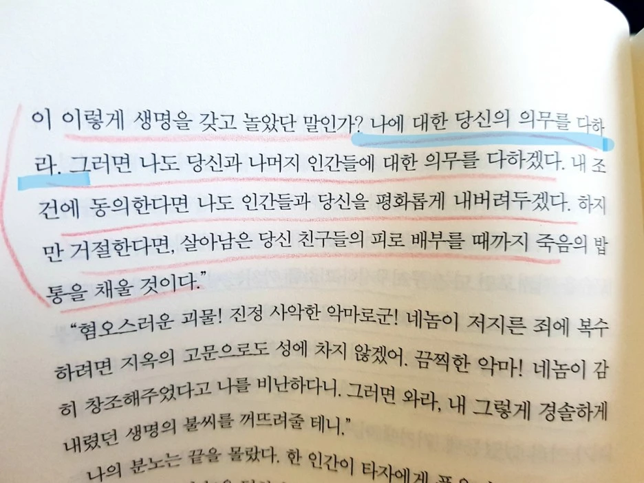 “혐오스러운 괴물! 진정 사악한 악마로군! 네놈이 저지른 죄에 복수하려면 지옥의 고문으로도 성에 차지 않겠어. 끔찍한 악마! 네놈이 감히 창조해주었다고 나를 비난하다니. 그러면 와라, 내 그렇게 경솔하게 내렸던 생명의 불씨를 꺼뜨려줄 테니.”(p.132)