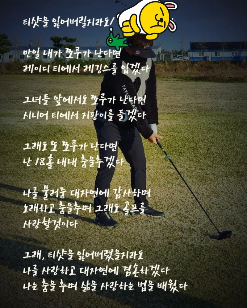 포기는 아니지만 대자연에 감사하며 명량골프로 전환한다. 춤을 추며 아무렇지도 않다고 노래한다. 부글 부를 끓는 속을 잠재우려 더 신나게 놀아본다. 어쩌겠나. 내 탓이지.