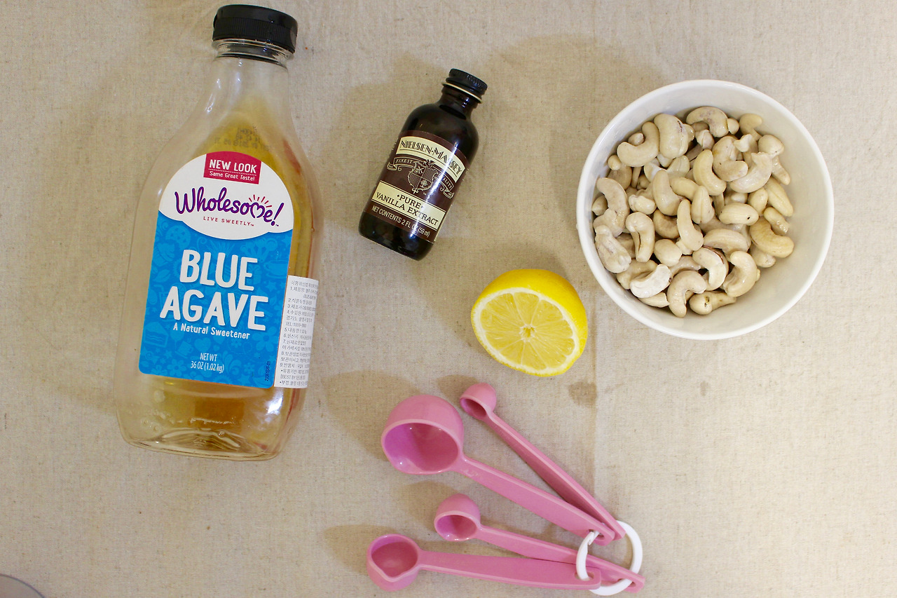 6. 캐슈넛, 아가베 시럽, 레몬즙 그리고 바닐라 익스트렉트를 믹서에 넣고 부드러운 크림 상태가 될 때까지 갈아준다. (만약 잘 갈아지지 않는다면 물을 조금씩 넣어가며 간다.)