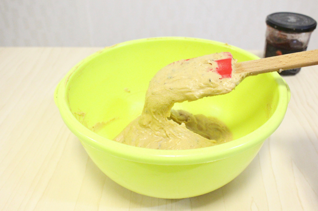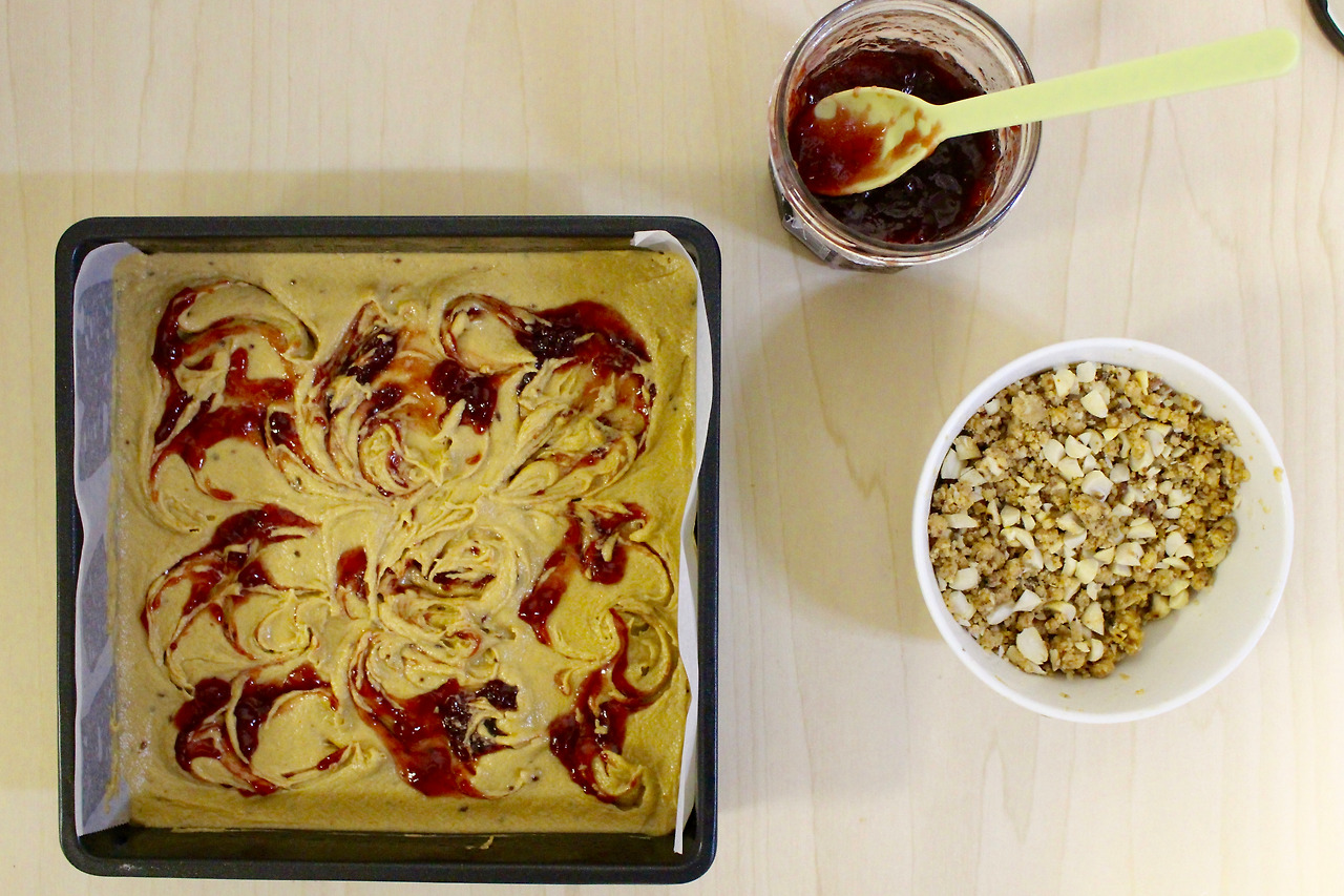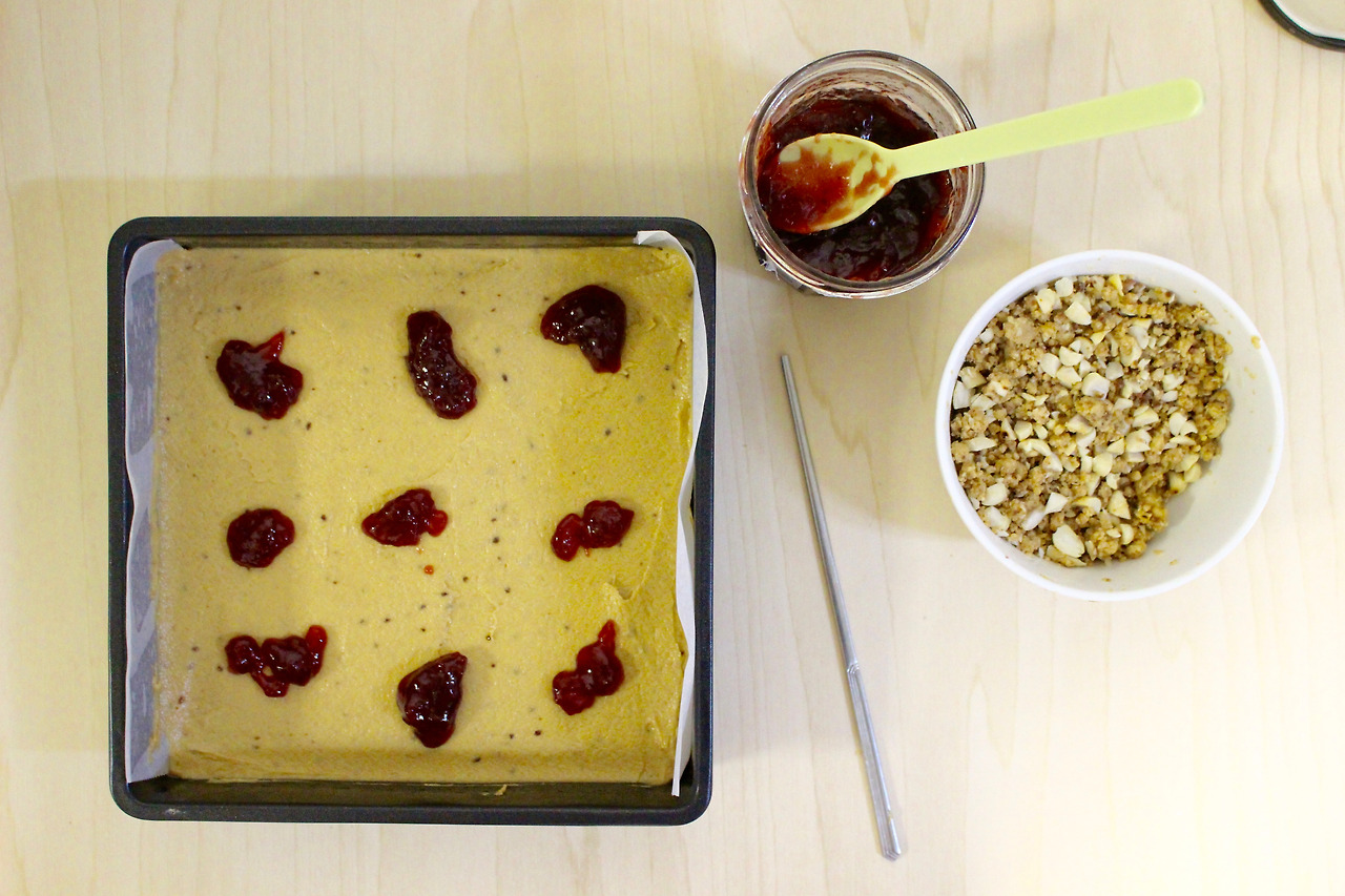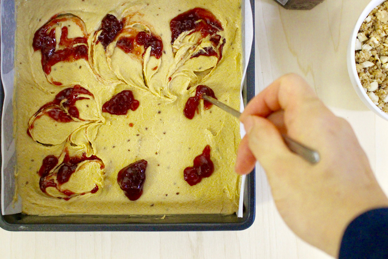 11. 젓가락을 사용해 딸기잼을 살살 휘저어 케이크 반죽과 섞이도록 해준다.