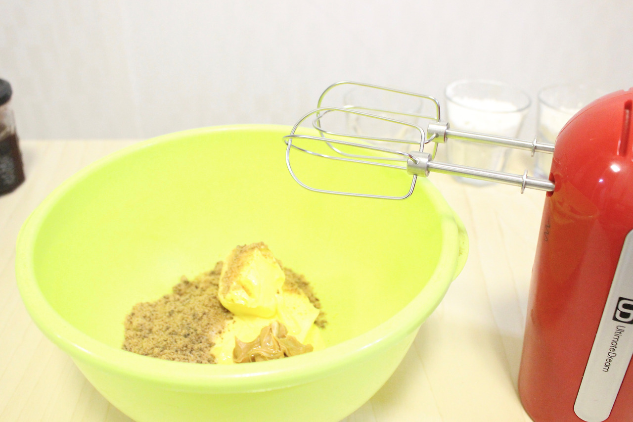 6. 다른 볼에 부드러운 실온 상태의 버터와 땅콩버터, 설탕을 넣고 휘핑기로 크림화한다.