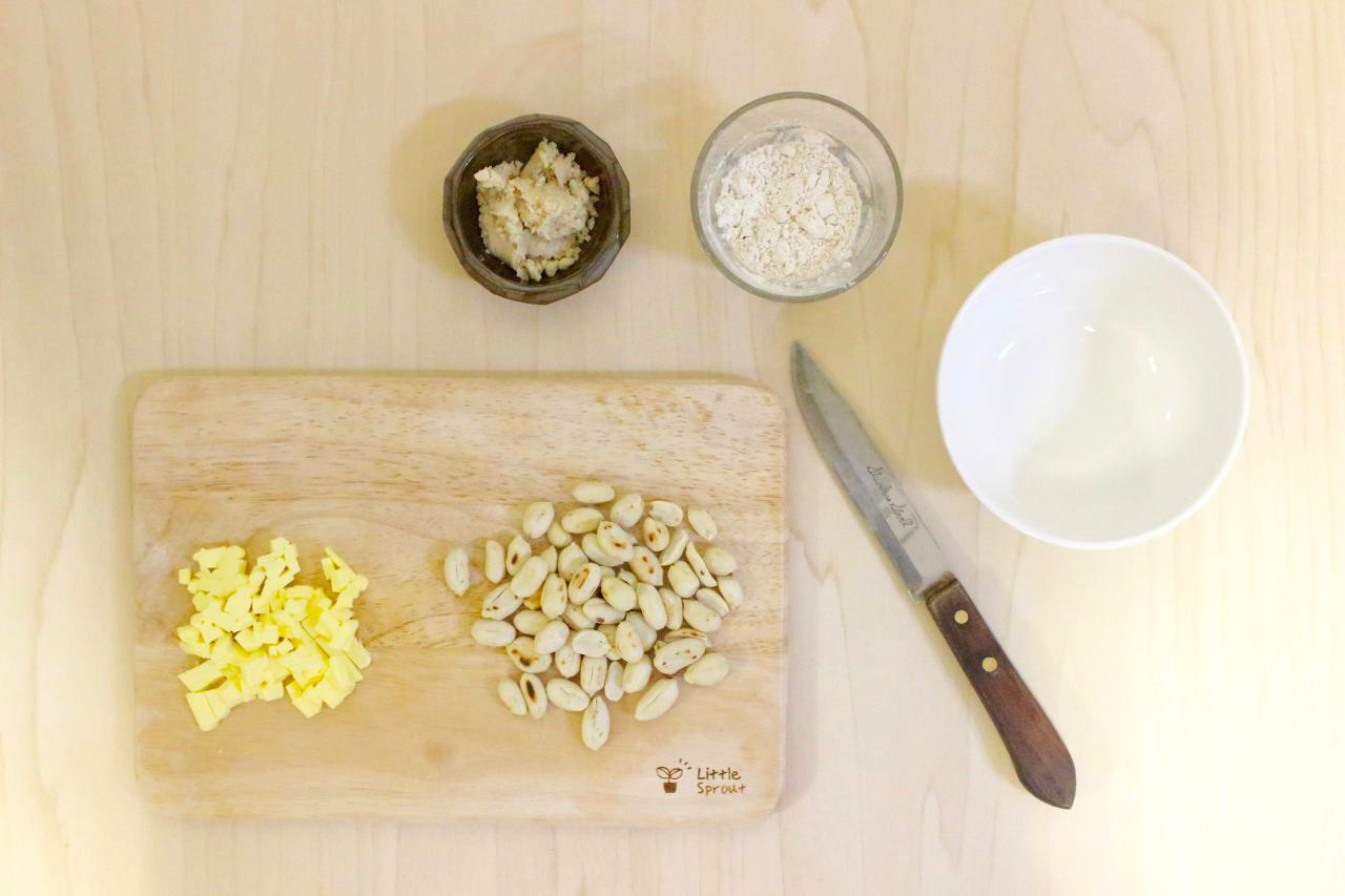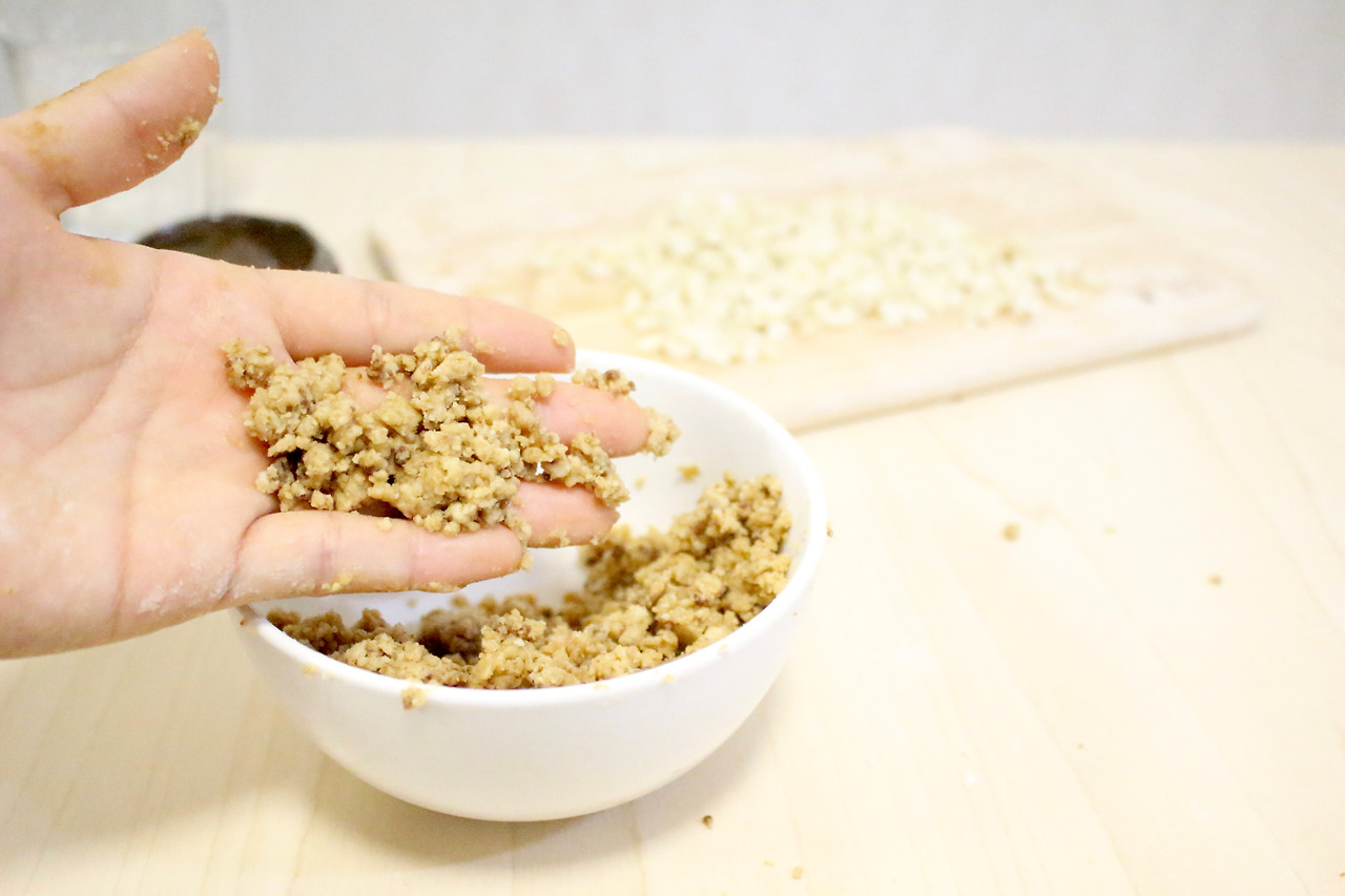 4. 볼에 썬 버터, 통밀가루, 간 땅콩, 비정제 설탕을 넣고 손으로 비비듯 섞는다.