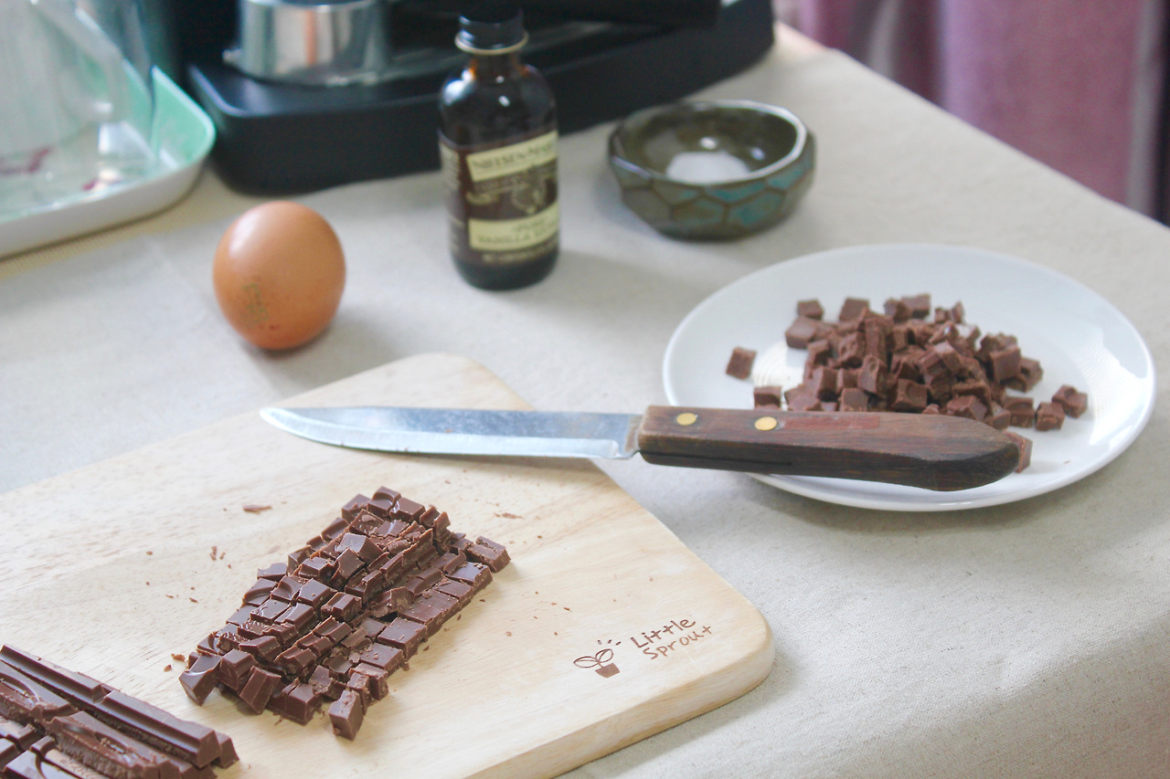 4. 초콜릿을 적당한 크기로 썰고 분량의 밀가루, 통밀가루, 베이킹소다, 소금을 준비한다.