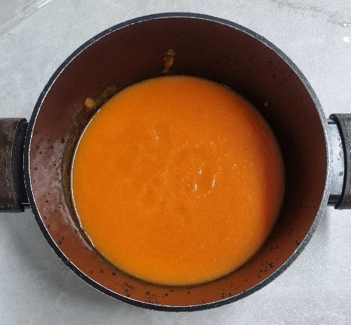 4. 갈아 놓은 당근을 냄비에 넣고 계속 저으며 끓여준다. 이때 소금과 설탕을 넣어 간을 맞춘다. 소금과 설탕 또는 꿀을 거의 동량으로 넣으라고 한 것 같은데, 단맛을 별로 좋아하지 않아 설탕을 적게 넣었다.(나중에 후회했다. 비율을 알려주는 건 다 이유가 있더라)