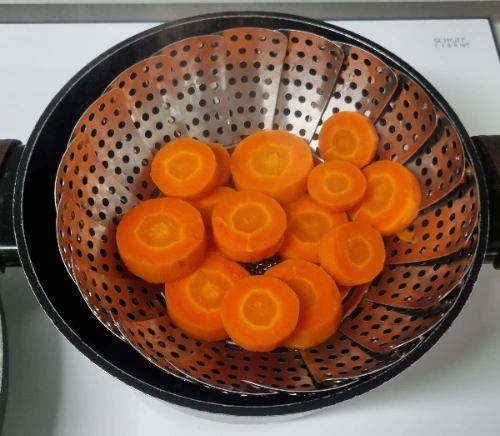 1. 당근을 깨끗이 씻어 찌기 좋은 크기로 자른다. 처음 시도해 보는 거라 망칠 수도 있으니 크지 않은 것으로 준비했다.