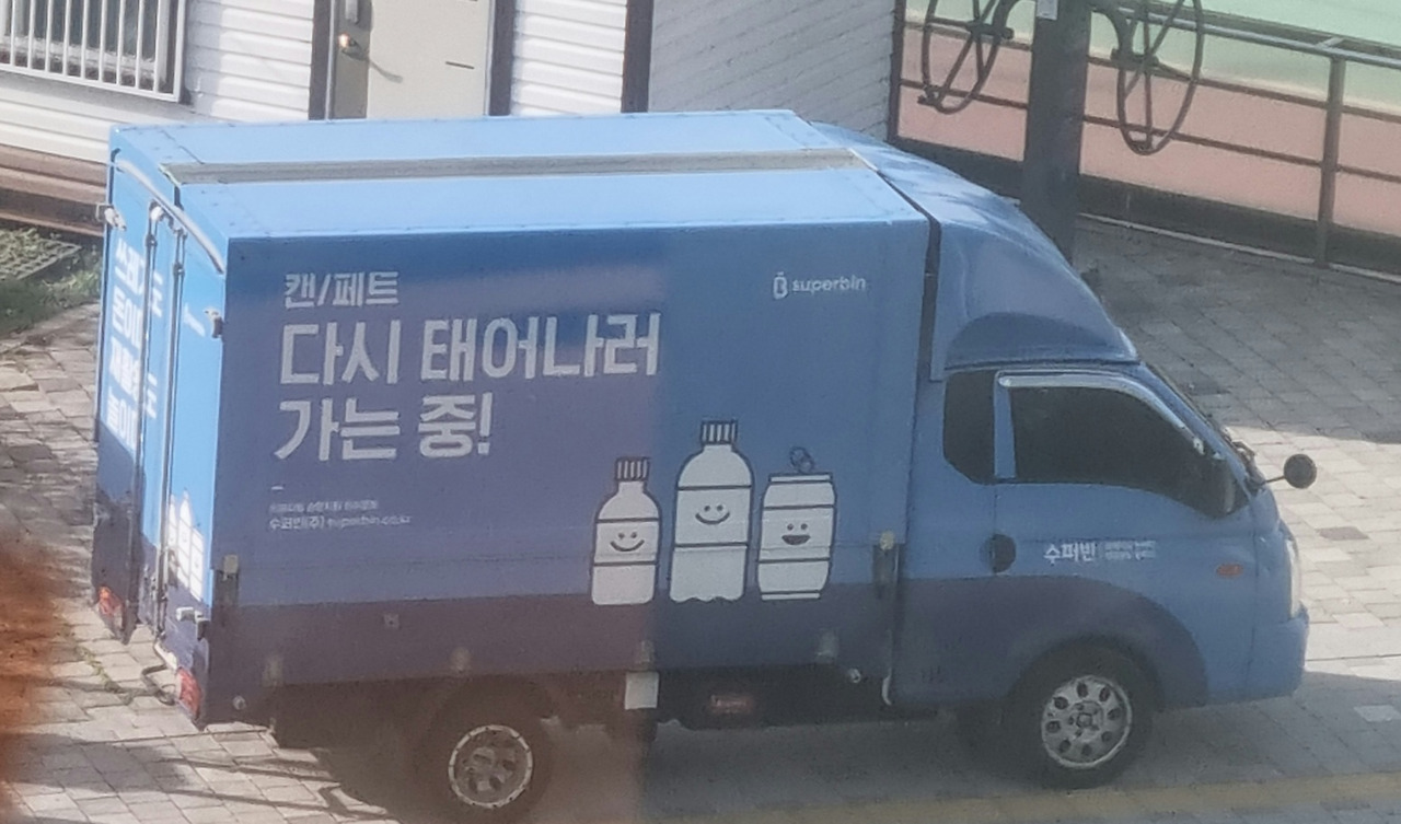 태어나러 가는 거면 산부인과인데 '다시'가 붙었으니 종교적인 의미가 있는 건가라고 생각했으나 그러기엔 트럭이 너무 푸르고 글자체 역시 적잖이 고딕이다. 자세히 보니 트럭 왼쪽 위에 캔/페트라 쓰여 있었다. 그래서 페트병과 캔들이 밝은 미소를 띠고 있구나. 자신의 재탄생이 무척이나 기분 좋은가보다.