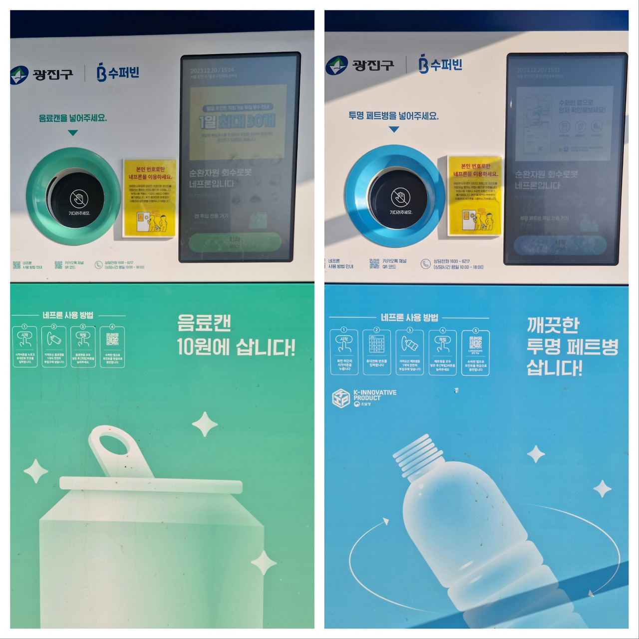 무심코 버리는 쓰레기들을 통해 수익화를 실현하고 있는 곳이 있었다. 순환자원의 가치를 공유하고 세상을 이롭게 바꿀 재활용 문화를 만들어가는 수퍼빈이라는 기업이다. 각 지역에 네프론이라는 AI로봇(폐기물 수거 기계)을 설치해 사람들이 캔과 페트병을 넣으면 재활용 가능한 것은 먹고 안 되는 것은 도로 내뱉는단다. 똑똑하기도 하지!