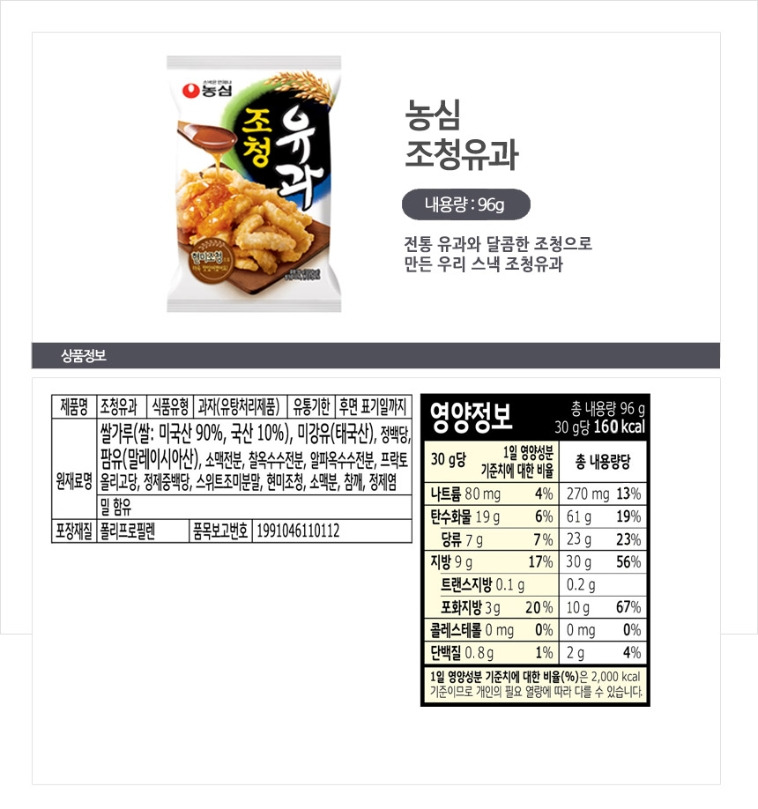 와 과자인 조청유과도 96g 한 봉에 설탕이 23그람 밖에(?) 안 들어갔다. (조청유과도 자연당을 가진 성분이 없기 때문에 당류량과 설탕량 동일) 오곡첵스초코는 100g인데 설탕이 30g이다.