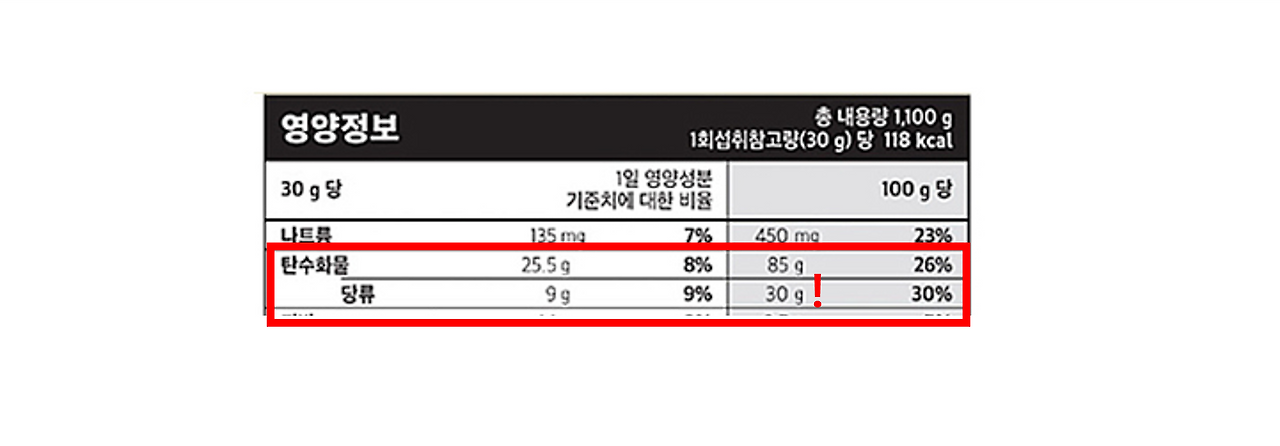 첵스초코 100g을 먹어도 당류가 권장량 30%밖에 안된다고 안심하게 만들지만 실제는 이미 어린아이나 성인여성의 건강 권장량 25g을 한방에 날리는 양이다.