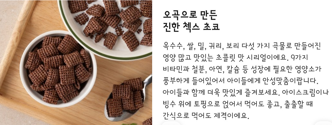 참고로 첵스초코의 유형은 '시리얼'이다. 즉 본질은 아침에 밥으로 먹으라고 만든것이다. 아무리 봐도 과자같이 생기고 맛도 과자맛이 나는데 아침밥이라고 그냥 우기는게 무안했는지 앞면에 "오곡으로 만들었다"는 점을 강조하고 있다.