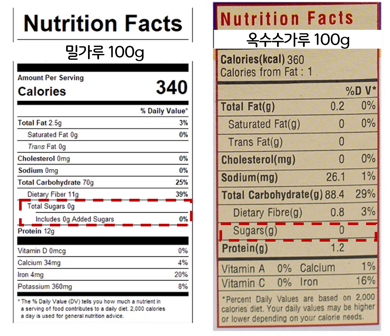 그런데 옥수수가루와 밀가루에 당분이 얼마 들었는지 아는가? 정답은....