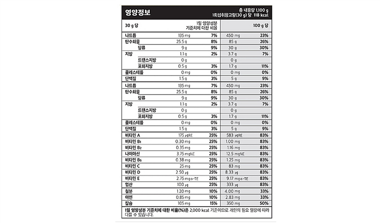 설탕의 정확한 량을 확인하려해도 영양정보에 없다. 우리가 목숨거는 탄단지가 그람으로 적혀있고 하루 기준치의 %로 환산해 탄단지가 골고루 잘 배합된 균형잡힌 느낌을 주고있다.