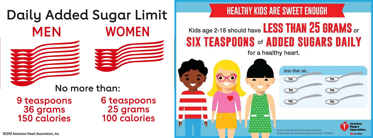 심장학회가 권장하는 설탕 하루 허용량 (좌-성인남녀, 우-소아청소년)