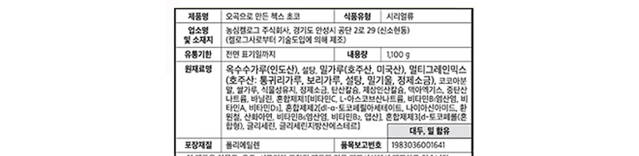 따라서 오곡첵스초코의 1등 재료는 옥수수가루이고 2등이 설탕 3등이 밀가루 되겠다. '멀티그레인 믹스'가 말그대로 오곡가루인듯한데 별거없다 귀리가루, 보리가루, 설탕, 밀기울을 섞은 것이다. 2등 재료가 설탕인데 멀티그레인 믹스에 설탕이 또 있다. 그 다음, 코코아 분말.. 쌀가루.. 그리고 또 기타 설탕...