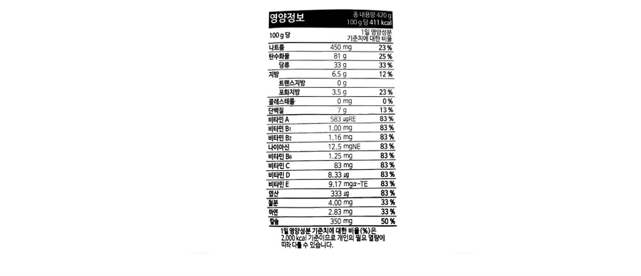 사실 특별한건 없다. 뒷면의 영양정보와 원재료란에 웬만한 정보가 다 들어 있기 때문이다. 하지만 판매된지 20년도 더 넘었는데 아직까지 영양강화 아침밥, 건강한 아이들 간식으로 팔리는 것을 보면 아직 정체를 잘 숨기고 있는 것다.