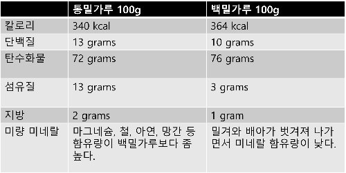 그래서 백밀가루에 비해 통밀가루는 좀 거칠고 맛이 떨어지지만 밀겨와 씨눈의 좋은 성분을 먹을 거라는 기대감이 있다. 하지만 기대감이 너무 크면 성분의 함량을 보고 실망할 수 있다.