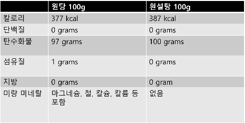 #비정제사탕수수: 원당이 비정제라고 가공을 안한게 아니다. 원당도 사탕수수 즙을 짜고 걸러 수분을 날리는데 많은 가공을 거친다. 2%미만의 미네랄이 효과가 있다한들 97% 설탕성분의 효과가 더 크고 빠를거다.