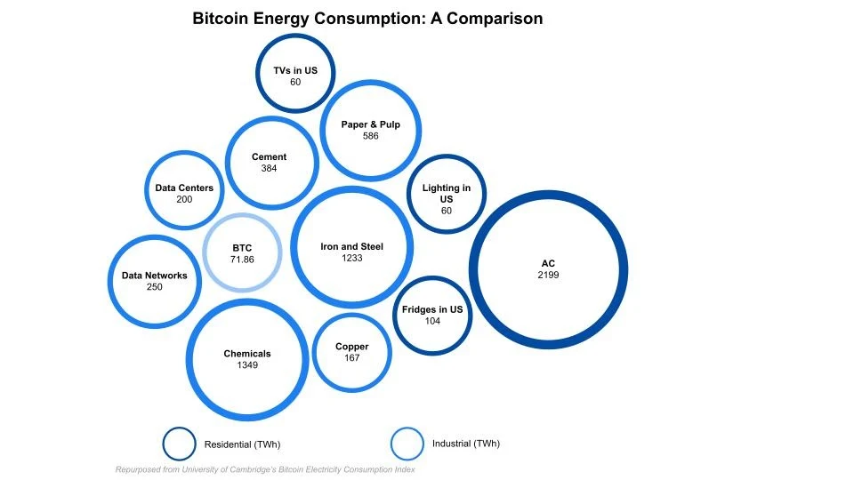 비트코인 채굴, 거래로 인해 드는 전기 소비량(71.86TWh)은 미국전체 티비, 전등 에너지량(60TWh)과 유사하다.