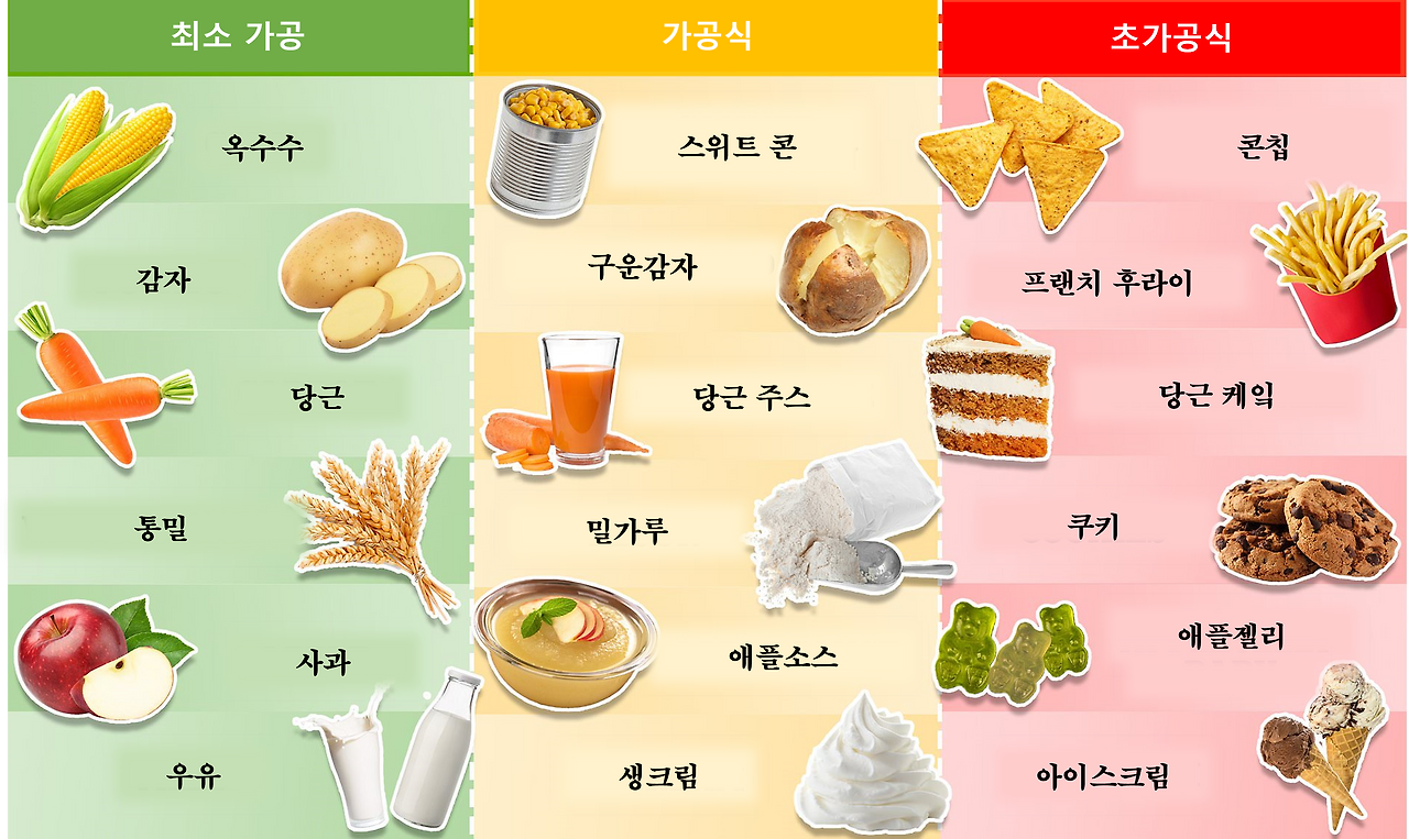 식품가공이라면 웬지 실험실이나 공장에서 일어나는 변신과정같지만 소화가 잘되게 하고 맛있게 만들기 위한 요리도 가공의 하나다. 생식이 아닌 이상은 가공식을 전혀 안먹는 것은 불가능하기 때문에 이상적인 것은 무가공이 아니라 '가공이 적은 음식'이다. 이에 반해 초가공식(Ultra Processed Food)은 원재료의 모습이 거의 남아 있지 않게 가공된 정제곡물(밀가루, 쌀가루), 설탕, 지방(오일)을 주재료로 하여 소금과 감칠맛을 추가해서 만들기 때문에 명확한 변신을 거친다. 마트 매대에서 손만 뻗으면 잡히는 탄산음표, ~~칩(혹은 ~~깡), 캔디(초코바, 사탕), 아이스크림, 시리얼, 레토르트식품, 냉동간편식이 대표적인 초가공식이다.