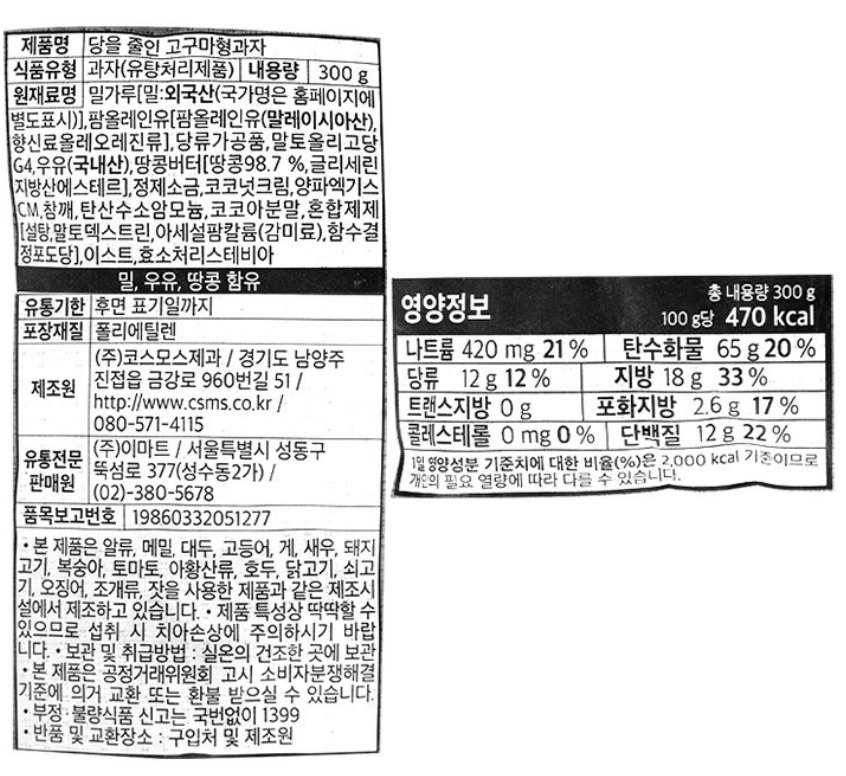 그건 고구마형 과자의 칼로리 결정자 TOP 2 는 밀가루와 옥배유 (혹은 팜유)이기 때문이다. 설탕이 좀 들어가든 덜들어가든 고구마형 과자의 본색이 GMO밀가로와 식용류의 콜라보라는 것은 달라지지 않는다.
