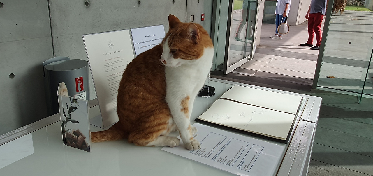 주차장으로 들어와 계단을 따라 올라가면 한쪽 벽면은 노출 콘크리트, 또 다른 벽은 유리로 되어있는 통로가 나오고 그 계단을 따라 올라가 고개를 돌리면 샤토 라 코스테의 아트센터이다(작품 2번). 아트센터 옆 낮고 잔잔한 물 위에 루이즈 브르주아의 거미 조각상(작품 3번)이 바람을 맞고 있다. 아트센터에 들어가니 영어를 매우 잘하는 친절한 안내원과 센터의 터줏대감 고양이가 우리를 반긴다.