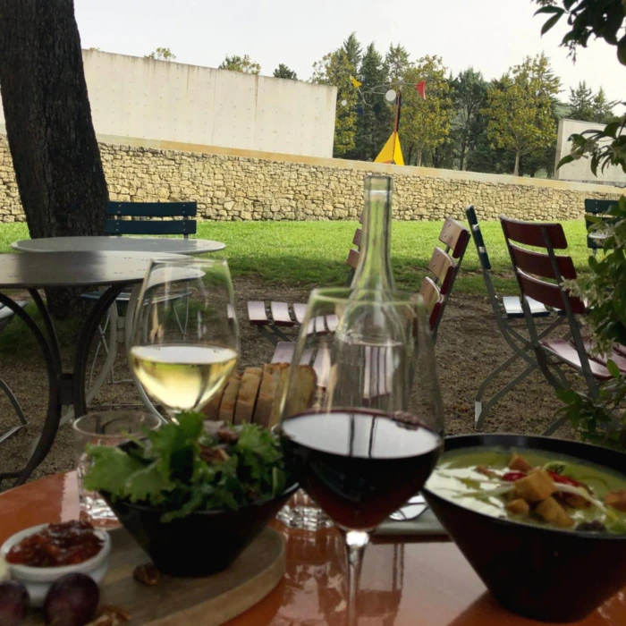 샤토 라 코스테의 야외 테라스 식당 'La Terrasse' .... 뒷편에 칼더 Calder의 작품 5번이 보인다.완두콩과 민트의 차가운 수프 (Cold bean and mint soup), 바게트 빵, 포도, 치즈, 와인이 오늘의 최고의 한 끼였다. 민트의 향이 맛을 더해주는 완두콩 수프는 다른 어떤 요리보다 멋지고 훌륭했다. 칼더의 작품 아래 바람이 불었다. 바람이 불어도 좋았다.