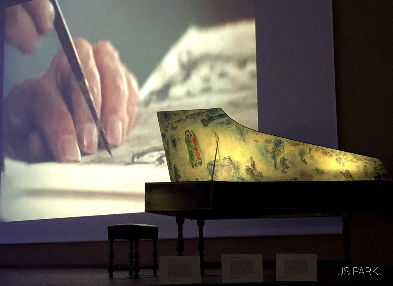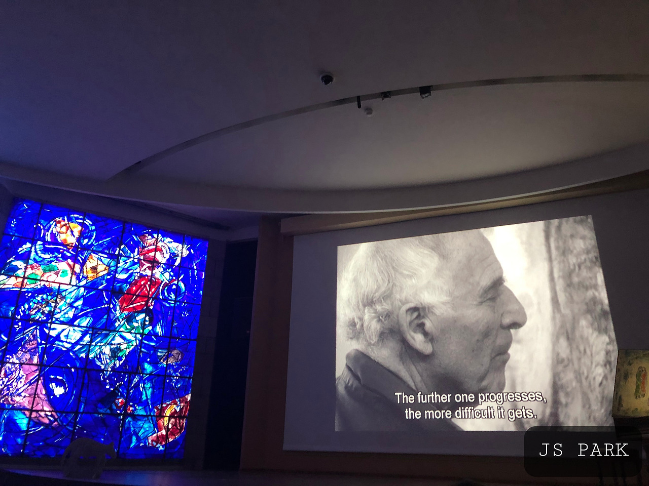 안쪽 전시실로 들어가니 생각보다 넓은 전시실에 샤갈의 성서 연작 시리즈가 전시되어있다. '노아의 방주', '바위를 치는 모세와 십계명을 받는 모세', '야곱의 꿈'을 지나 '이삭의 희생', '아담과 이브가 등장하는 낙원', 인간의 창조' 그림을 지나니 온통 붉은 계열의 그림들이 5점 전시되어 있다. 그림 속에서 생 폴 드 방스 마을이 보인다. 파랑과 빨강의 색채에 홀린 듯 건물 끝, 작은 콘서트 홀 안으로 들어갔다. 중앙 화면에 샤갈에 관한 영상이 나오고 화면 옆, 샤갈이 직접 제작한 파란색 가득한 스테인드글라스가 한쪽 벽을 가득 채웠다. 홀 중앙의 화면 밑에는 그랜드 피아노가 놓여 있었다... 피아노 역시 샤갈의 그림이다.