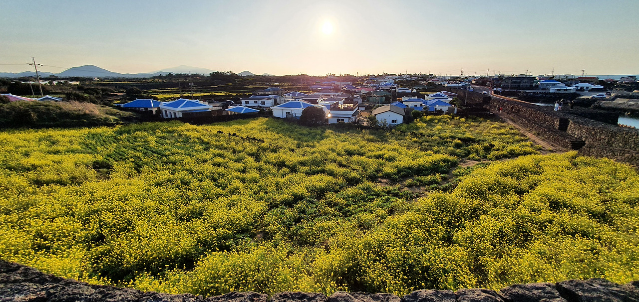 성산일출봉을 둘러싼 유채밭은 어제 녹산로만큼 소란스러웠다. 어제보다 밝은 노란 유채꽃과 맑은 햇빛이 빛났다. 유채꽃 사이로 철없이 얼굴을 내미는 보라색 무꽃도 엄마와 사진 찍는 어린아이도 사랑스러웠다. 자전거로 달리는 28.32km 내내 유채꽃 향기가 맴돌았다. 하도리에 돌아와 별방진 성벽에 올랐다. 작은 성벽 위에서 내려다보는 마을 사이로 저녁 햇빛에 반짝이는 하도리 유채꽃이 나를 반긴다. 성벽 위에도 성벽 아래 마을에도, 한라산 소주를 마시는 남편과 마주한 짙푸른 저녁 바다에서도 하루 종일 유채꽃 향기가 아른거렸다.