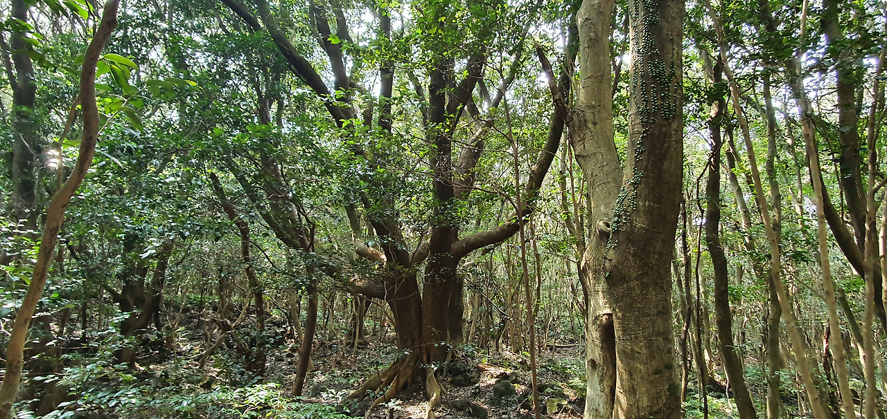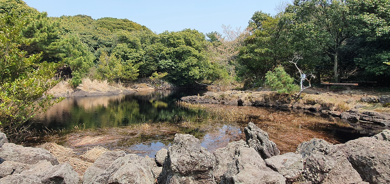 비밀의 숲의 입구에서 한걸음 들어섰을 뿐인데 무성한 짙은 초록이 다가온다. 곶자왈은 숲과 덤불을 뜻하는 말로 나무와 덩굴로 이루어진 숲이다. '도틀굴'이라는 용암동굴이 있다. 4.3 사건의 아픈 역사가 남아있다. 부드러운 길 위에 동백꽃잎이 떨어져 있다. 길을 걸으며 선흘리 사람들의 생활터전이었던 숯가마터와 같은 흔적도 보인다. 초록의 이끼가 가득한 바위틈에 뿌리내린 나무들 사이를 걷다 보니 동백동산의 보석, '먼물깍'에 도착했다. 움푹 팬 용암지대에 물이 빠지지 않고 고여 있으면서 생겨난 고요한 습지 위로 시간이 멈춘 듯하다.
