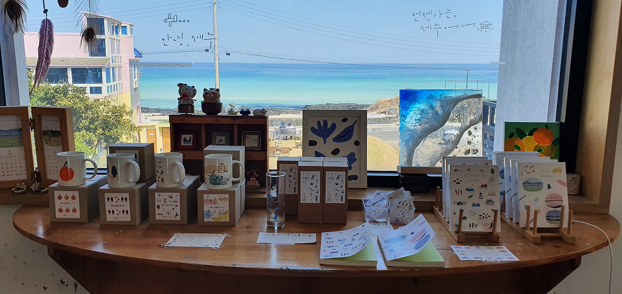 바닷가 근처 예쁜 문방구로 향했다. 문방구로 올라가는 계단에 삼색이 고양이가 익숙한 듯 우리를 반긴다. 길냥이를 입양해 키우는 친구가 가방에서 고양이 츄르를 꺼내 내밀었더니 다가와 맛있게 받아먹고 엉덩이를 내밀어 준다. 친구와 나는 궁둥이 팡팡을 해주었다. 소소한 손그림으로 만들어진 예쁜 문구류가 가득하다. 친구는 동생에게 줄 선물을 골랐다. 가게 주인 아가씨는 길냥이들을 돌보다 보니 집에 고양이가 4마리 있고 밖에 있는 삼색이는 가게를 지킨다고 한다. 세화씨문방구의 고양이들은 문방구 물품의 모델이 되어 자기 밥벌이를 한다고 기특하다고 말한다. 주인 아가씨의 마음도 얼굴도 예쁘다.