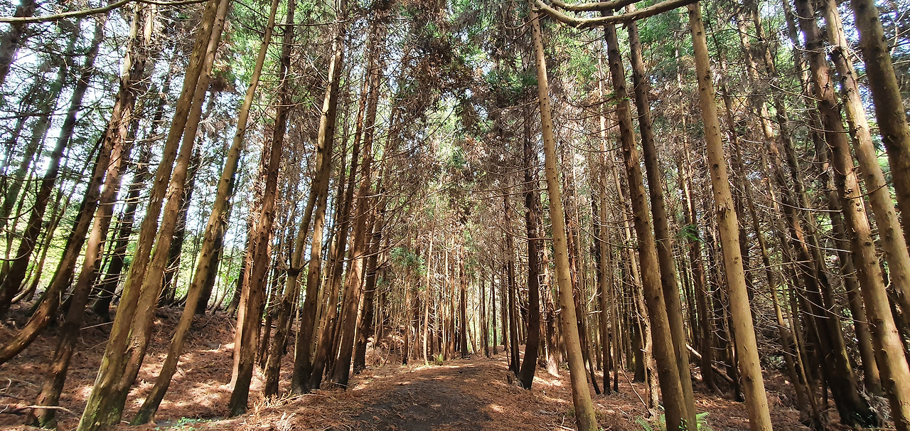오일장에서 돌아오는길에 하늘이 맑아지고 해가 비춘다. 바다는 아침과 또 다르다. 간단히 샌드위치로 점심을 먹고 '안돌 오름'으로 떠났다. 안돌 오름은 송당리에 있는 오름이다. '안돌 오름'보다는 '비밀의 숲'이 스냅사진 명소로 알려져 있지만 과감히 비밀의 숲을 지나 300m 걸어가면 안돌오름 입구 표지를 발견할 수 있다. 안돌오름 초입에 쭉쭉 뻗은 나무들의 군락이 사진 명소보다 못하지 않다. 그리고 천천히 오름을 오른다.